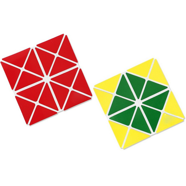 С одной стороны «Четырёхцветный квадрат» выполнен из 16-и треугольников жёлтого и зелёного цвета, с другой – из 16-и треугольников красного и синего цвета. На плоскости все треугольники отодвинуты друг от друга на одинаковое расстояние до 0,5 см, что обеспечивает эстетичный вид игры, возможность чёткого визуального и тактильного выделения составляющих элементов и линий сгиба, а также лёгкое складывание квадрата по этим линиям. Благодаря наличию треугольников 4-х цветов возможно конструирование сложных красочных фигур.