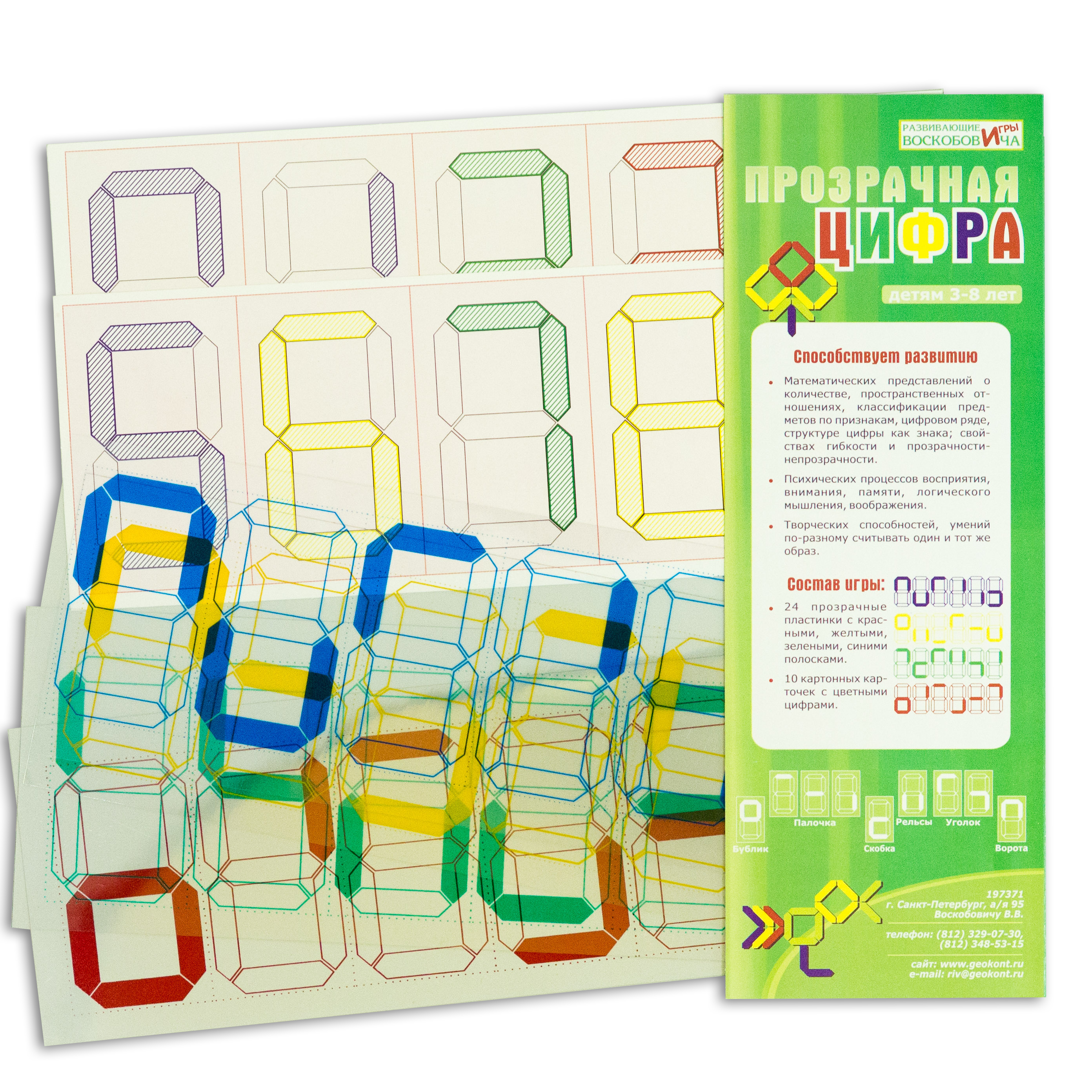 Игра «Прозрачная цифра» от ООО Развивающие игры Воскобовича входит в комплект конструктора «Прозрачный квадрат», но может быть предложена для игровой детской деятельности и как самостоятельный дидактический материал. Игры с «Прозрачной цифрой» способствуют развитию элементарных математических представлений ребёнка, его зрительного внимания, ассоциативной памяти, мыслительных операций сравнения, группировки, классификации, анализа и обобщения.