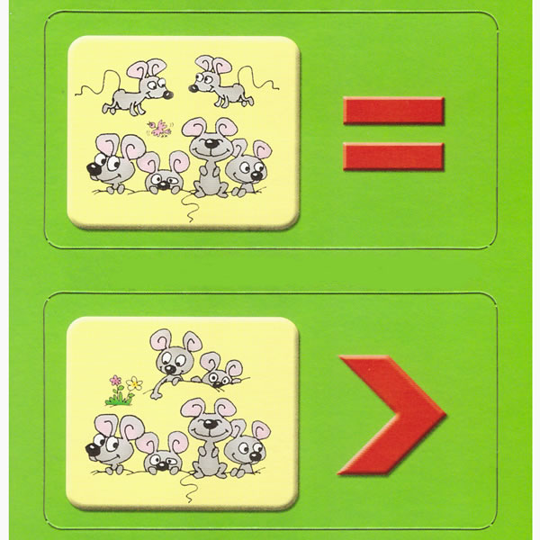 Игра состоит из одной стартовой карточки размером 11,5 х 11,15 см. Она имеет форму многоугольника. По центру карточки нарисованы весёлые мышата, слева, справа, сверху и снизу от них изображены математические знаки «больше», «меньше», «равно». Также в набор входит 38 маленьких карточек-домино размером 9,5 х 5 см. На них изображены мышки и математически знаки. Карточки выполнены из плотного многослойного картона, рисунки нанесены нетоксичными красками. К игре прилагается подробная инструкция игры.