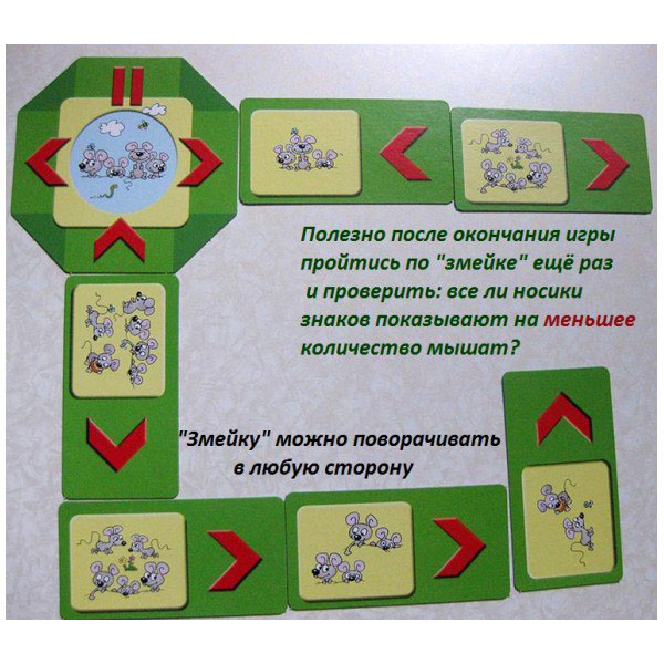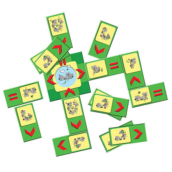 Как играть в лото? После того как с детьми провели демонстрационную игру и показали по какому принципу карточки-домино соединяются между собой в процессе игры, можно перейти уже непосредственно к игровому турниру. Стартовая карточка кладётся в центре игрового поля. Маленькие карточки раздаются всем участникам игры в равном количестве. По очереди дети присоединяют свои карточки, ориентируясь на количество мышат в окошке. Например: на одной из сторон стартовой карты нарисован знак «равно», значит, малыш должен выбрать карточку с таким же количеством весёлых мышат и присоединить к основе. Следующий игрок, также ориентируясь на знаки должен продолжить игру, подобрав нужную картинку. Выигрывает тот участник, у кого на руках не останется ни одной карты.