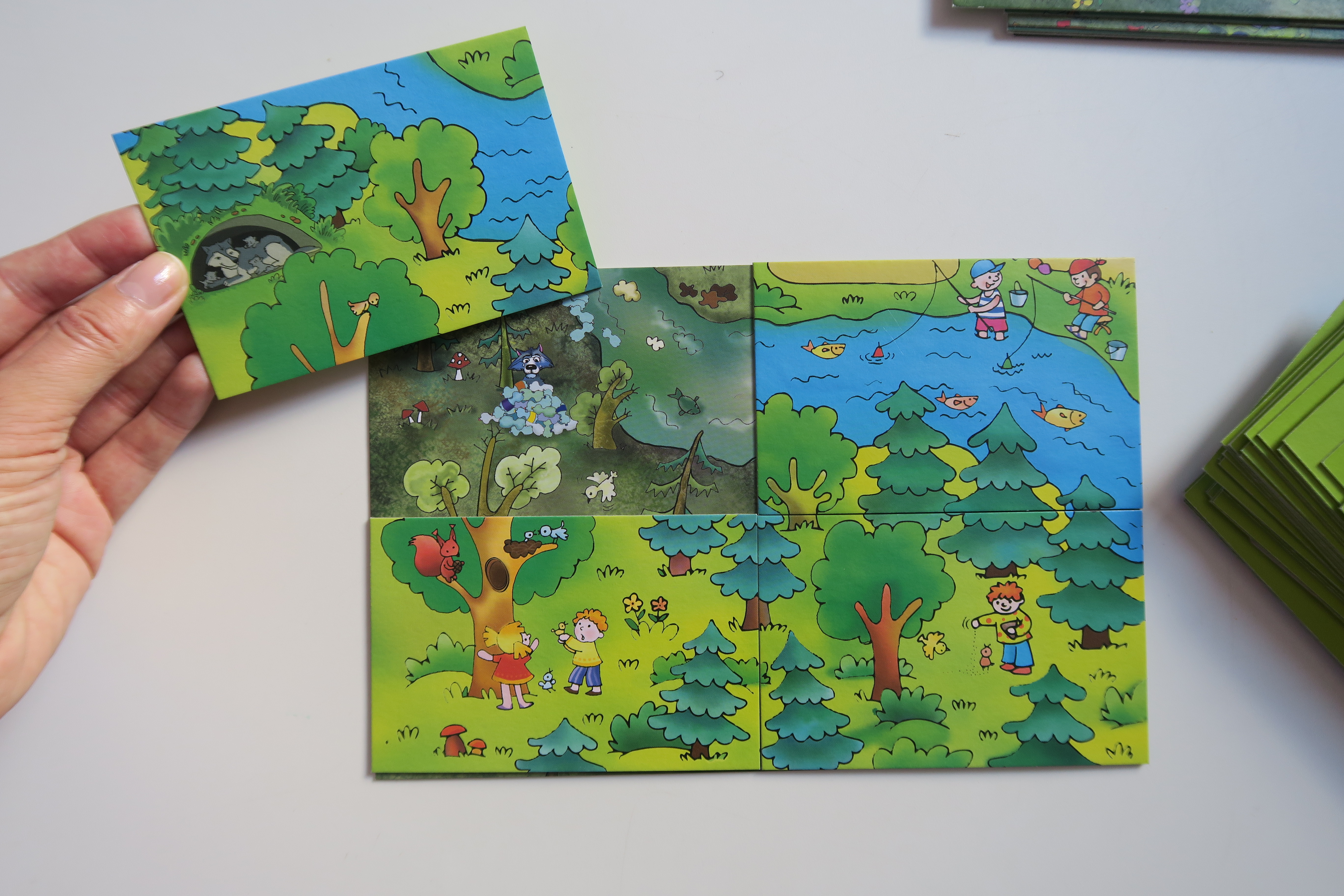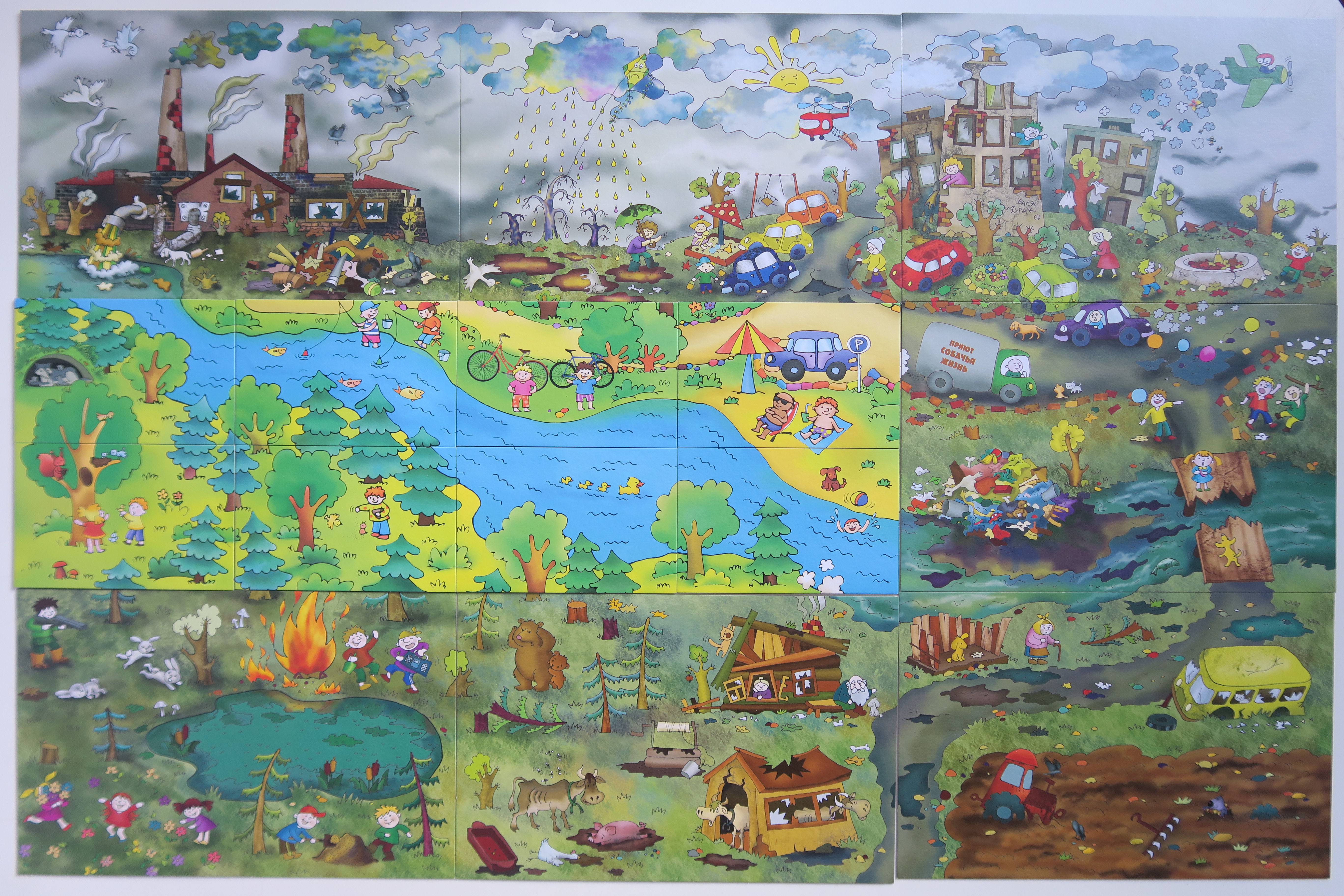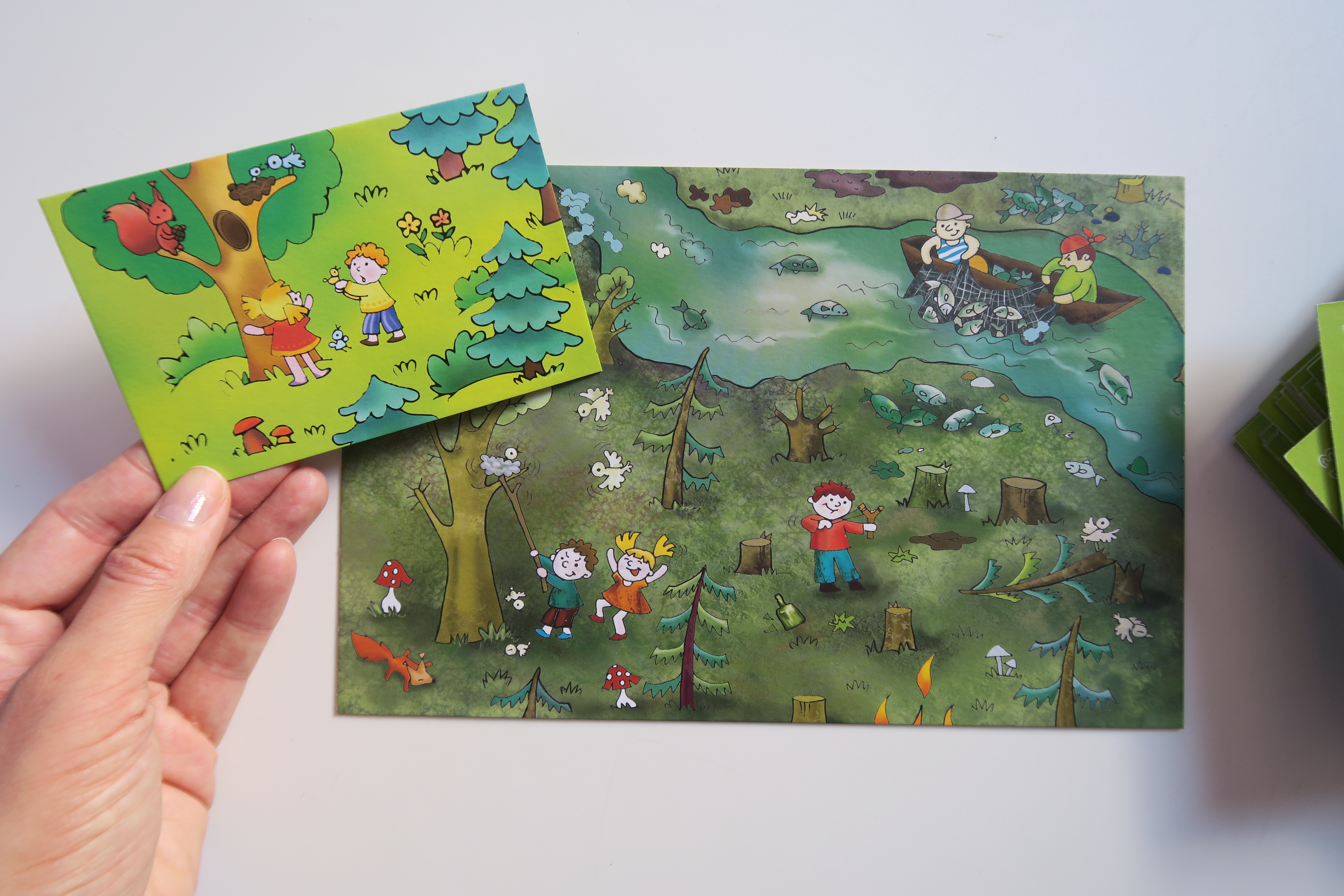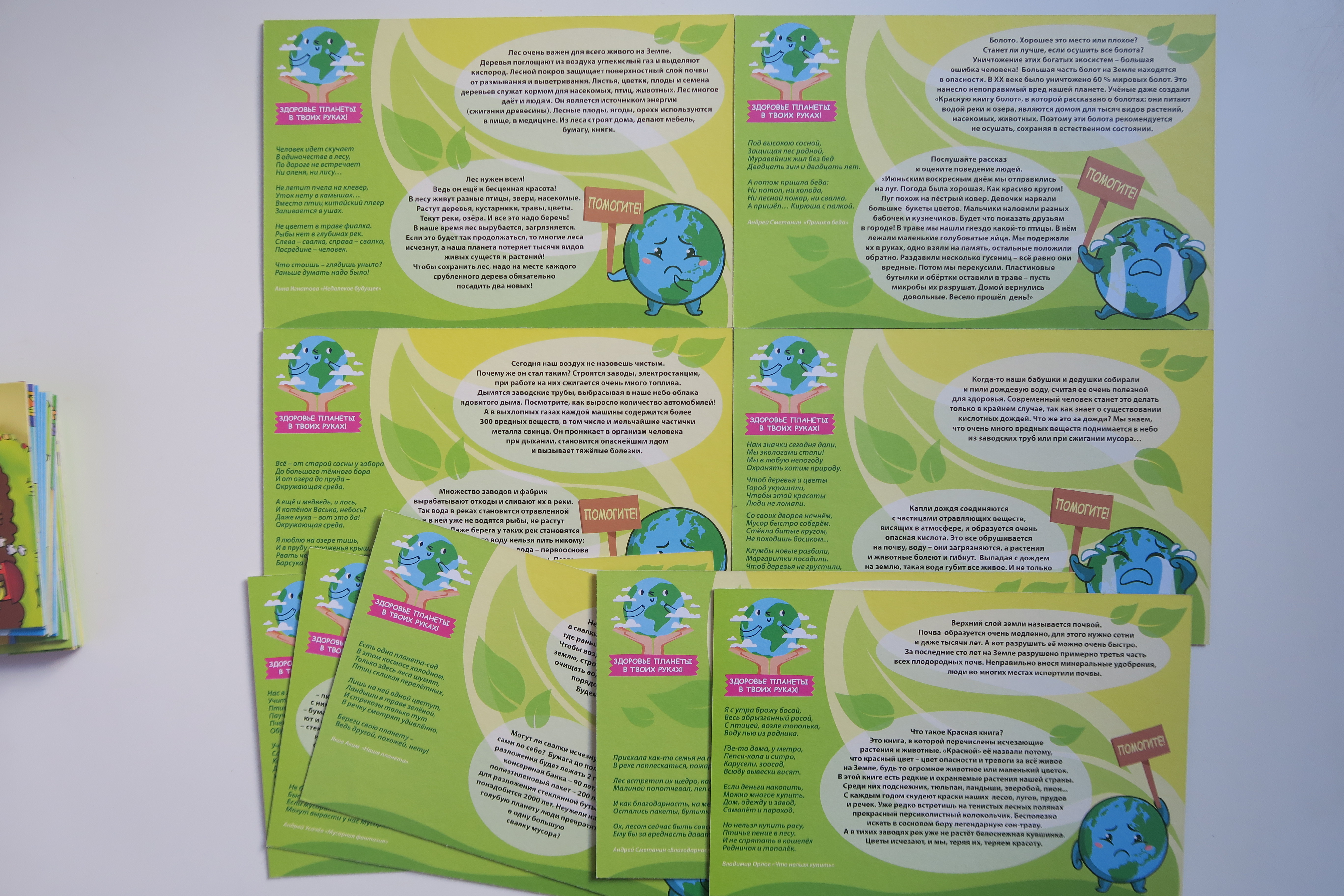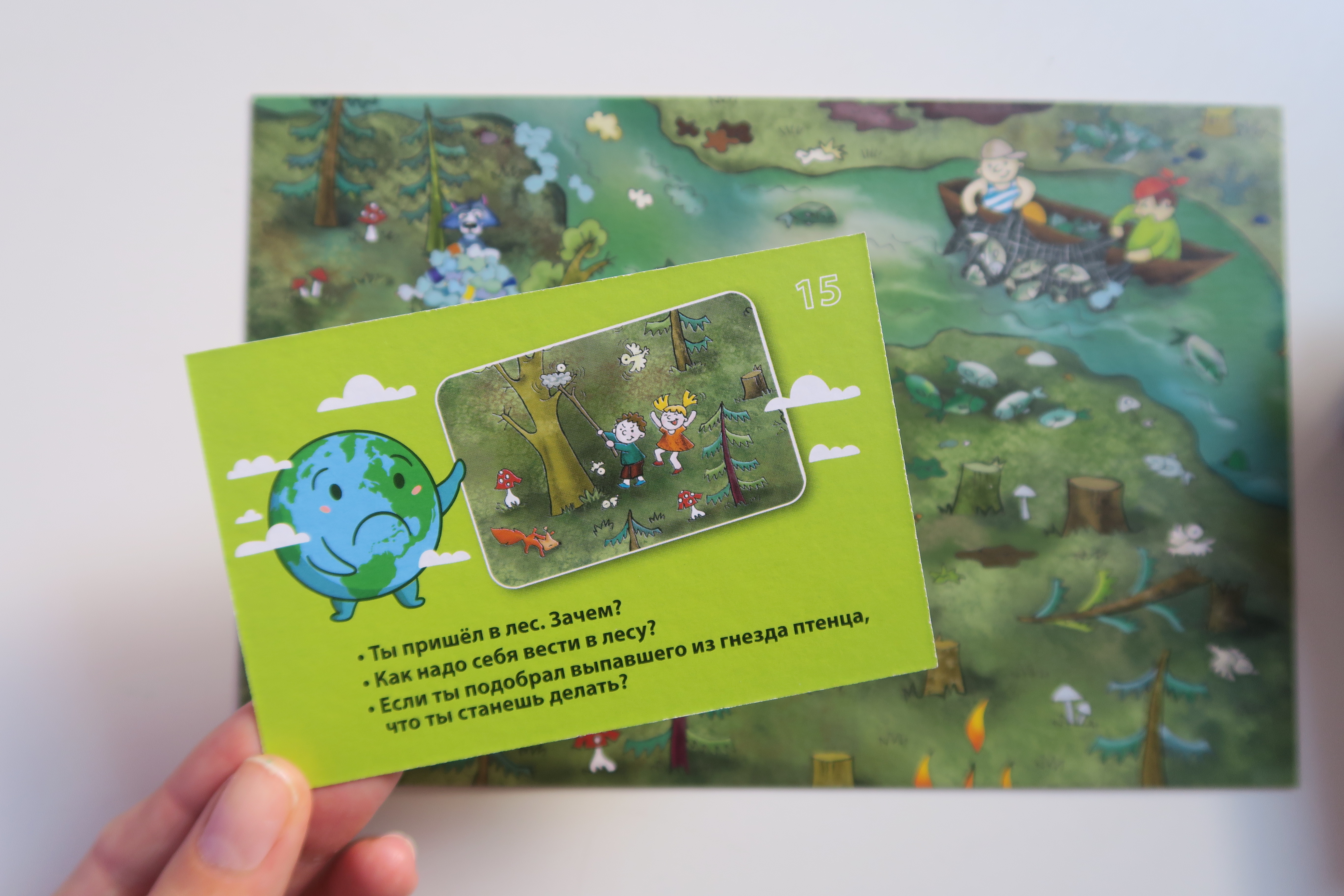 Правила игры простые: посмотри на картинку и расскажи, что люди делают неправильно, как можно исправить ошибки. Таким образом, и сложится правильная картинка и наше будущее, когда наша планета Земля станет чистой и свежей. В наборе «Экологические истории» 9 игровых полей и 36 карточек с заданиями, карточки изготовлены из картона, достаточно прочные и предназначены для многоразового использования. Каждая карточка двусторонняя: на одной стороне яркая картинка с «неправильными» действиями людей. На обороте содержится «поэтический эпиграф» к каждому сюжету. Эта информация поможет подготовиться взрослым к поучительной беседе с малышами. Например, почему возгорается лес и что должен сделать человек, чтобы избежать лесных пожаров, кто страдает от пожаров и сколько лет понадобится для полного восстановления сгоревшего леса.