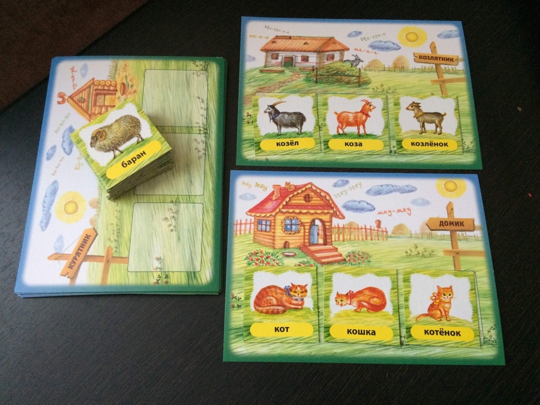 Мы с ребенком после того, как разместили все семьи в их домах, придумывали разные истории о том, какие интересные события произошли у котиков или собачек, уточек или цыплят, разыгрывали интересные театральные сценки. Лото понравилось. Рекомендую его в качестве пособия для развития речи, памяти, логики, для изучения животного мира и их места проживания.