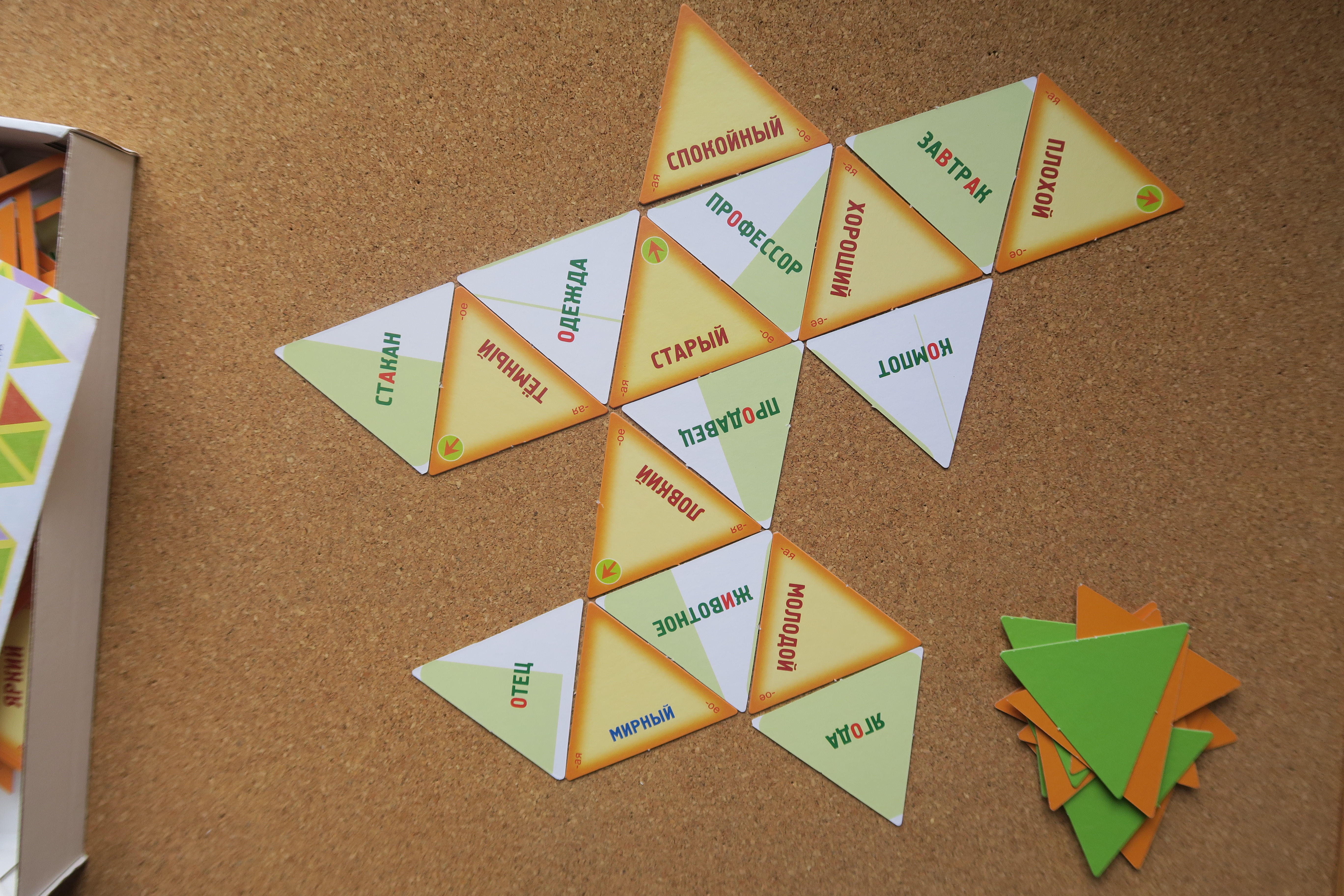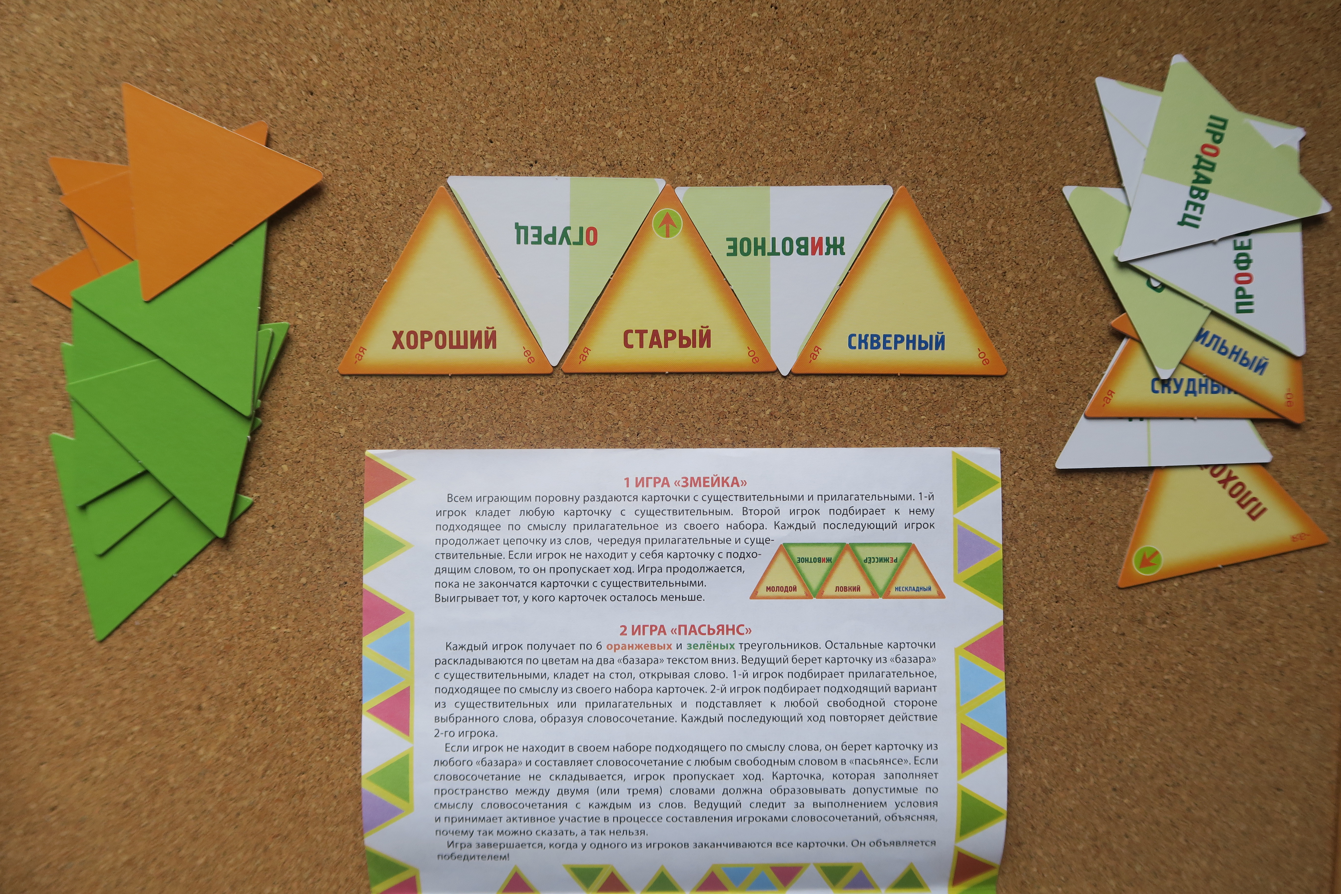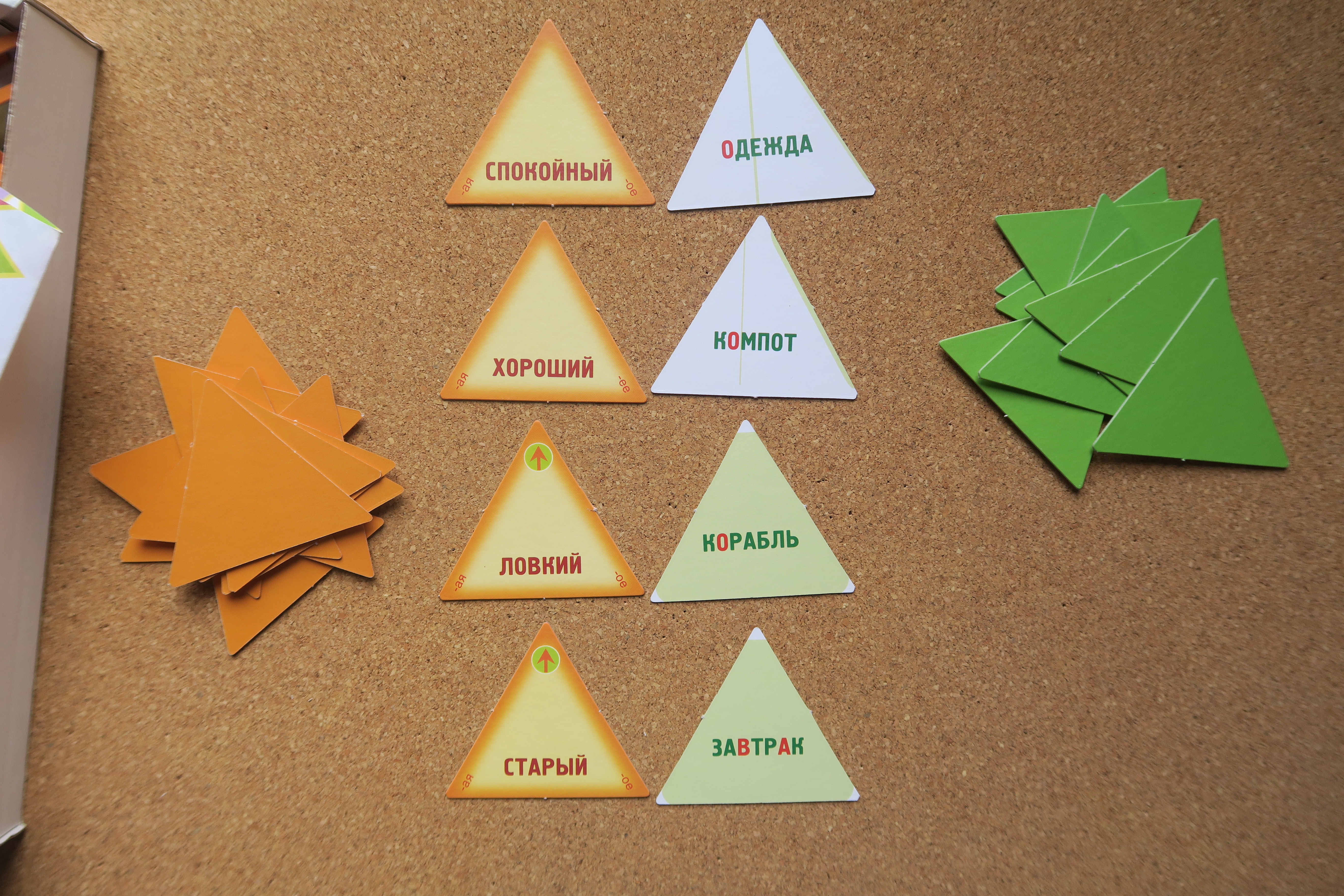 Выигрывает тот, кто первый правильно подобрал к своим прилагательным синонимы и обосновал их смысл. 4) Наша любимая веселая игра, в которой все карточки переворачиваются, игроки по очереди берут зеленый и оранжевые треугольники, читают слова и составляют словосочетания, иногда очень смешные. Старый завтрак, ловкий корабль, а может выпасть и "черствый огурец", но, если игрок объяснит, придумает логичное объяснение, он забирает пару слов и зарабатывает очко.