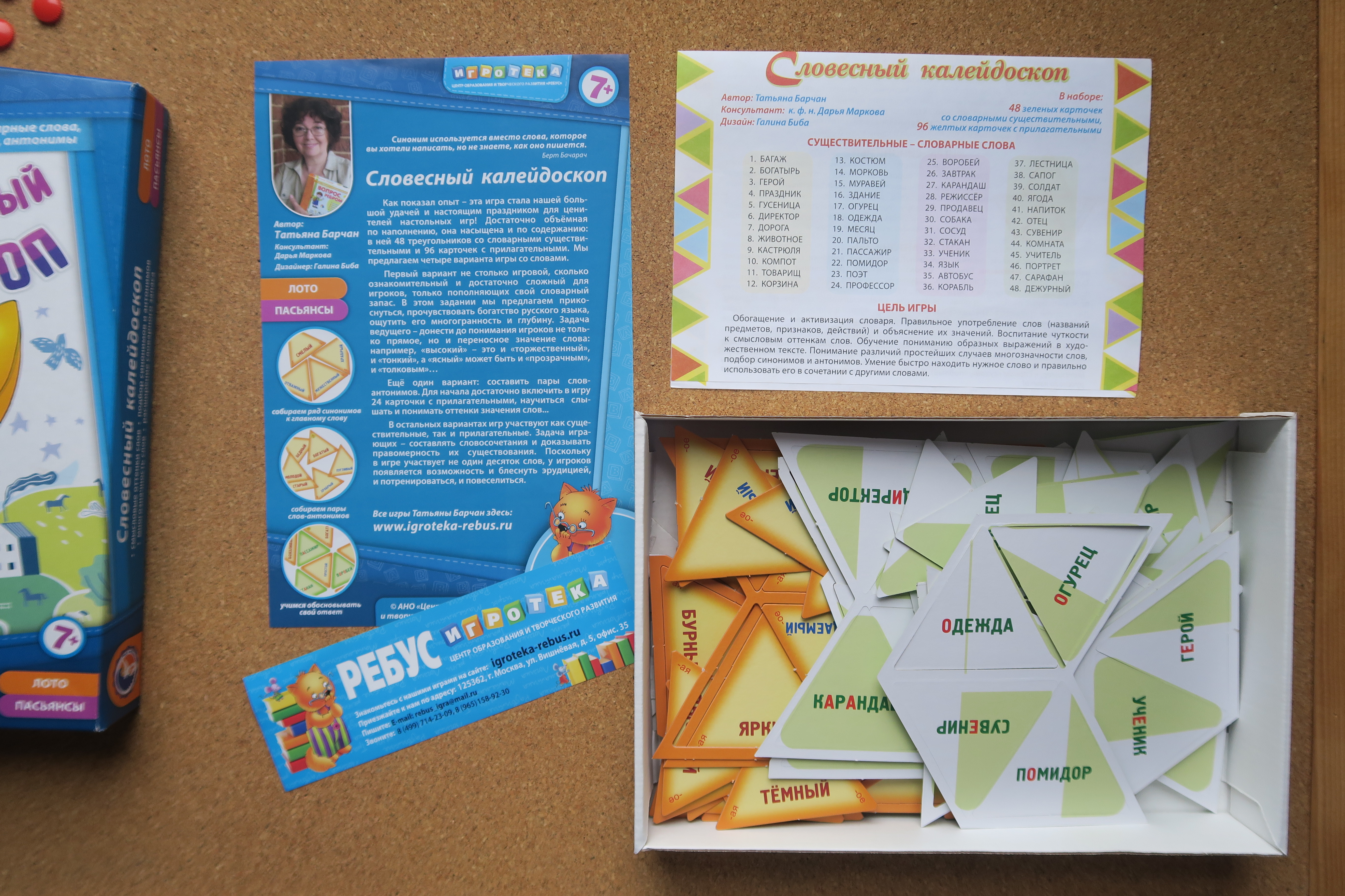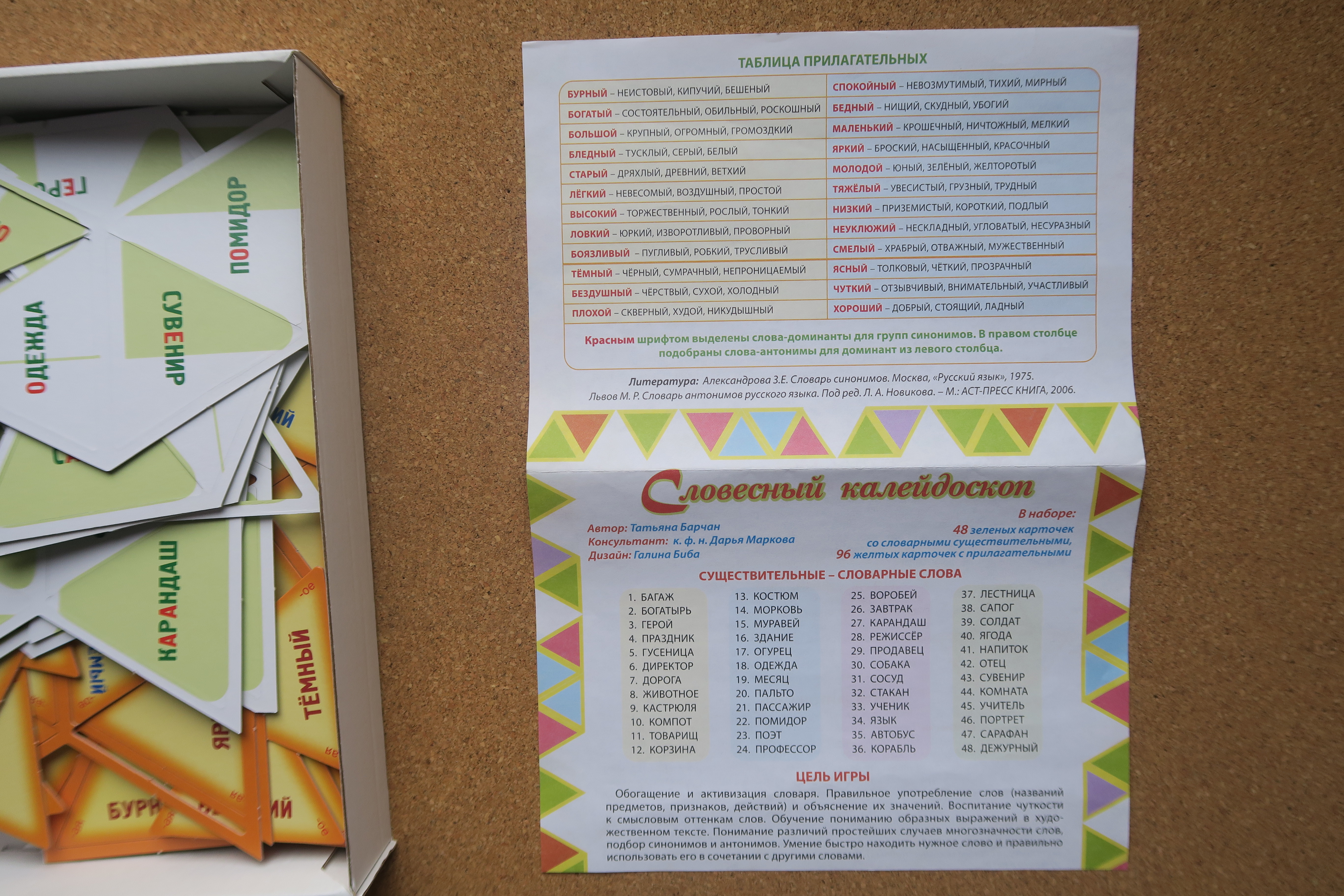 Словарные слова, синонимы и антонимы – такие темы освоят дети с помощью игры «Словесный калейдоскоп». Игра рассчитана на детей от 7-и до 11-и лет. Играть можно в одиночестве или в большой дружной компании, дома или в школе. Данный набор включает в себя 96 прямоугольных карточек с прилагательными, 48 треугольных карточек с существительными, подробную иллюстрированную инструкцию, в которой описаны правила и различные варианты игр.