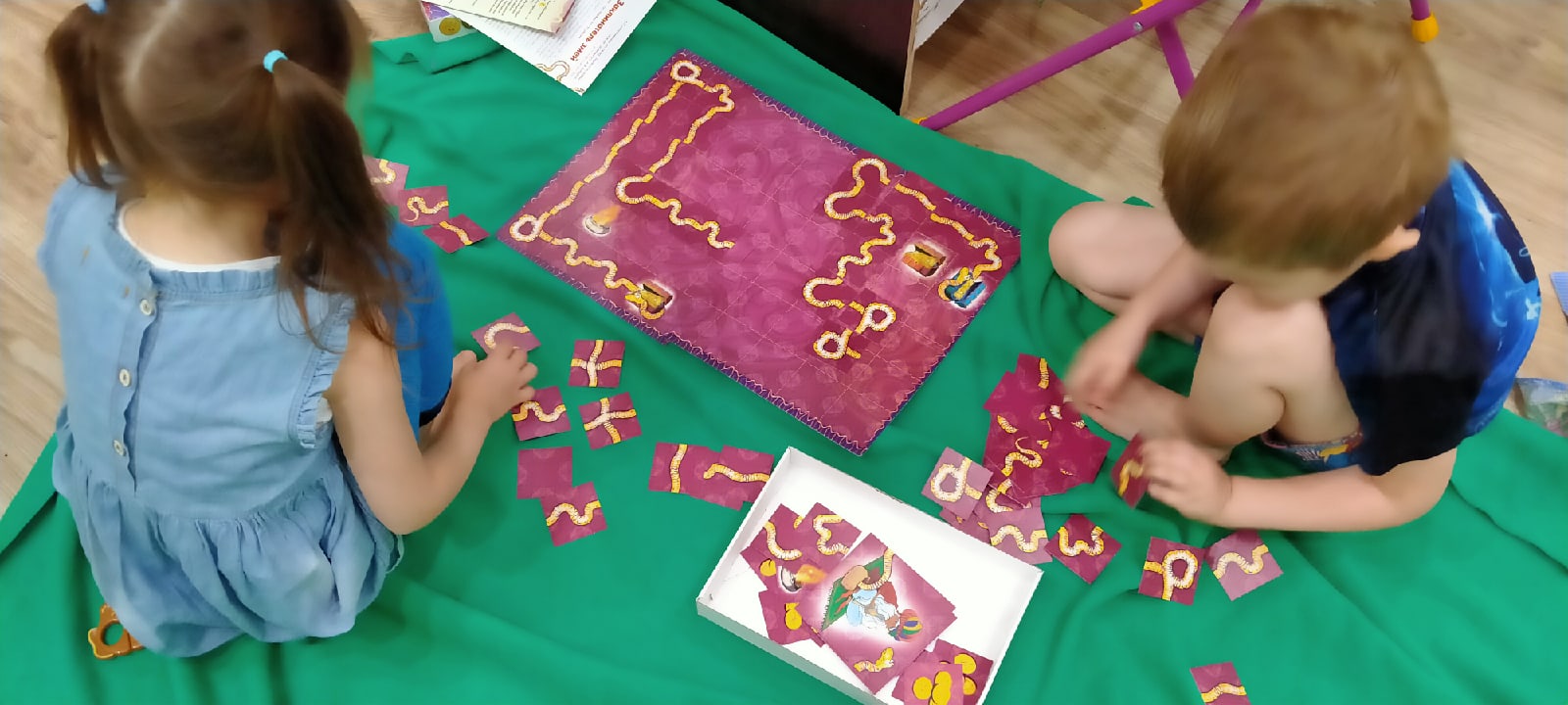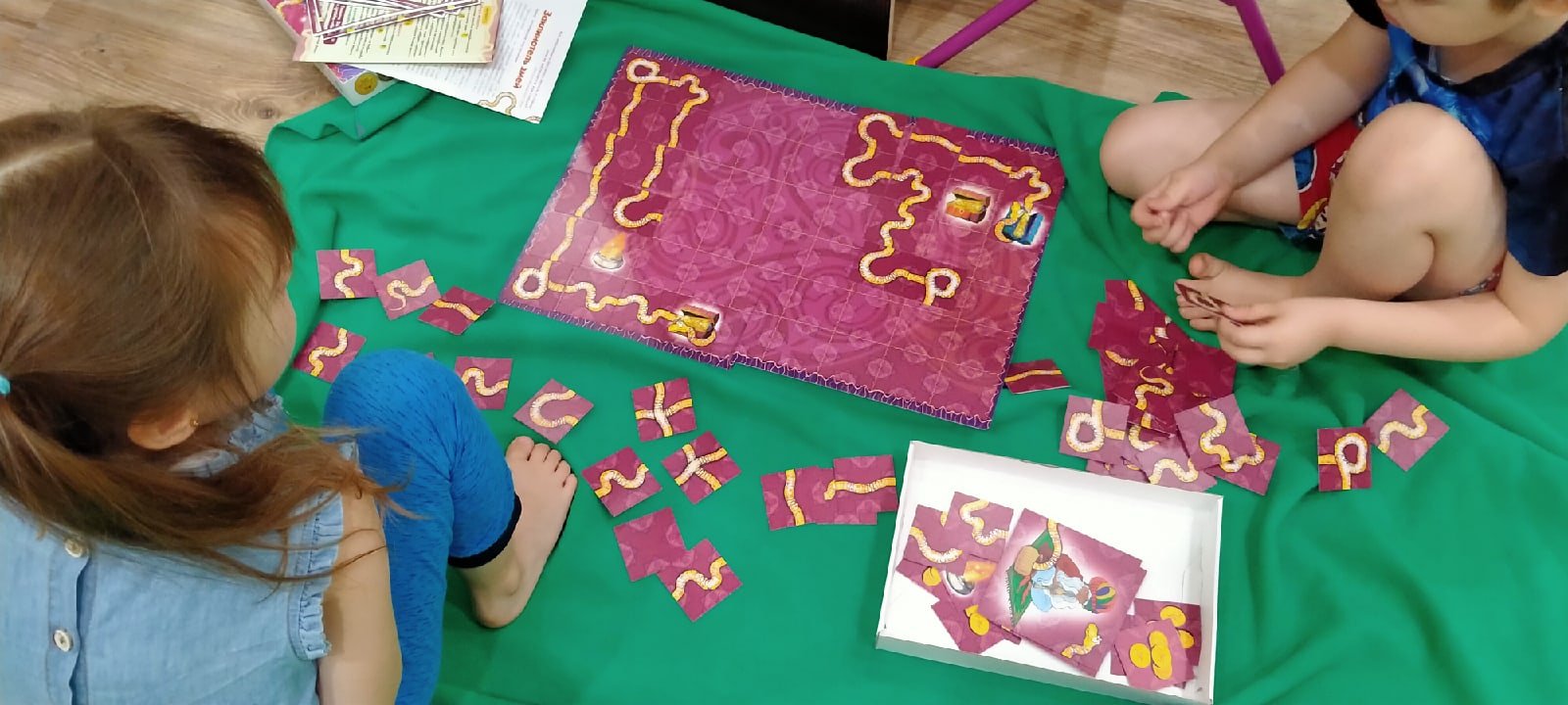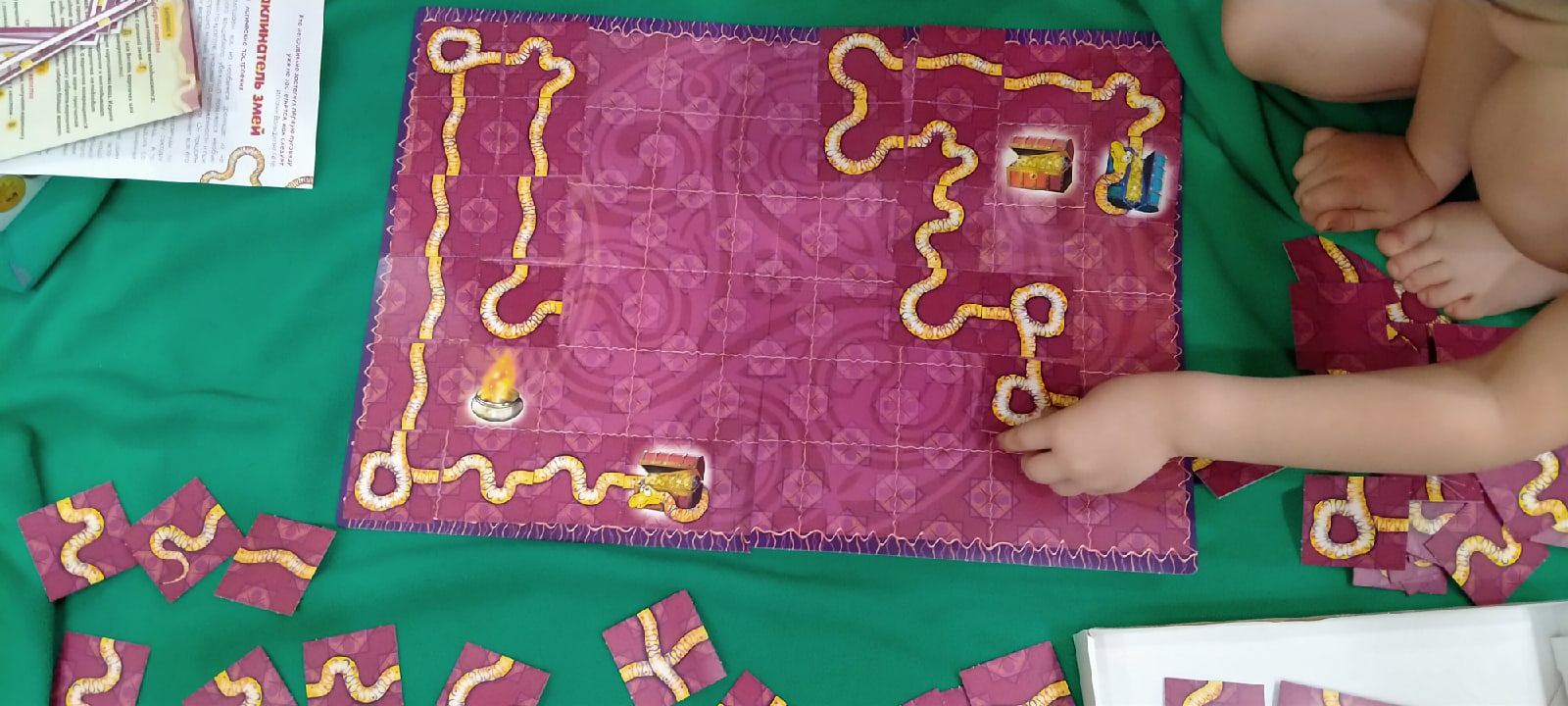 - Сложить самого длинного змея. На любую клетку на игровом поле выкладываются карточки «сундука» и «голова змеи». Игрокам нужно из маленьких игровых карточек попытаться собрать целого змея, при этом не затронув ни чаши с огнем, ни сундука.