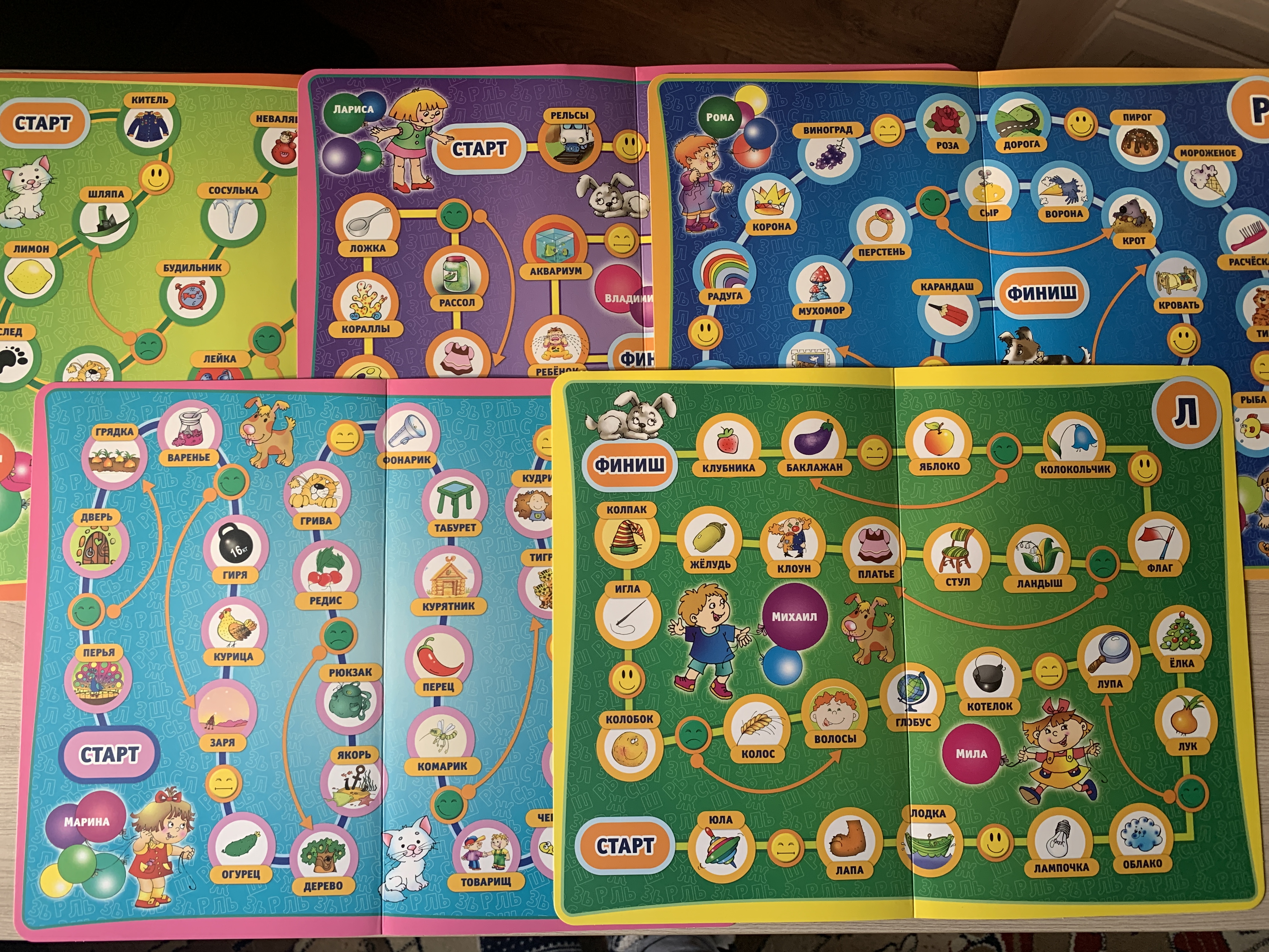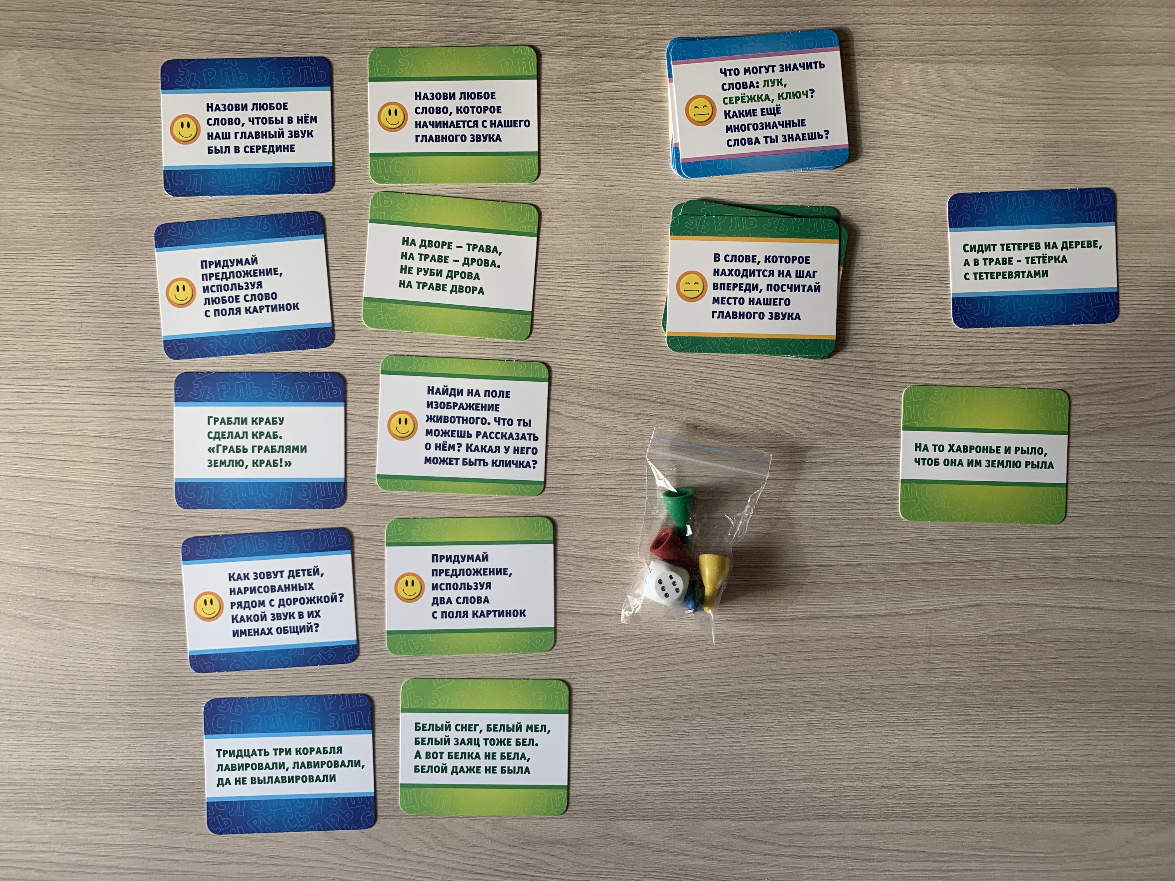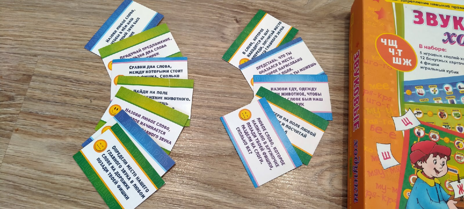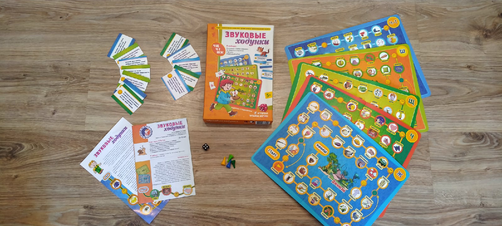 В набор «Звуковые ходунки Р,Рь, Л,Ль» входит: игровые поля разного цвета размером 34 х 25 см (5 шт/); бонусные карточки с заданиями(12 шт/); игровой кубик; пластиковые фишки (4 шт/) разного цвета (красная, синяя, жёлтая, зелёная); подробные правила игры. Темой становятся звуки «Р», «Рь», «Л», «Ль» и их правильное произношение. Участвовать могут от одного до четырёх игроков.