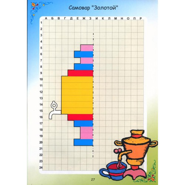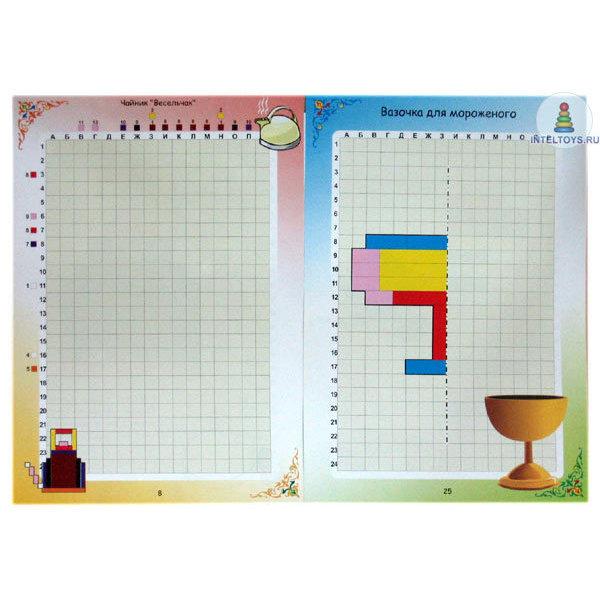 Для начала ребёнку предлагается выложить изображение предмета при помощи палочек Кюизенера по контуру, затем на обороте изображение нужно выложить самостоятельно по указателям. Для того чтобы выполнить это задание, малыш должен знать буквы и цифры, каждая ячейка указателя имеет цифро-буквенный адрес. Указатели расположены вокруг рабочего поля в виде системы координат. Когда и это задание малыш освоит, ему можно предложить выкладывать палочки по устному указанию взрослого, который будет диктовать адрес из цифр и букв. В игре также есть задания на завершение рисунка. Детям предлагается изображение половинки предмета, им нужно будет выложить эту половинку и завершить рисунок, располагая палочки зеркально. Так ребята в игре познакомятся с понятием симметрии и её свойствами.