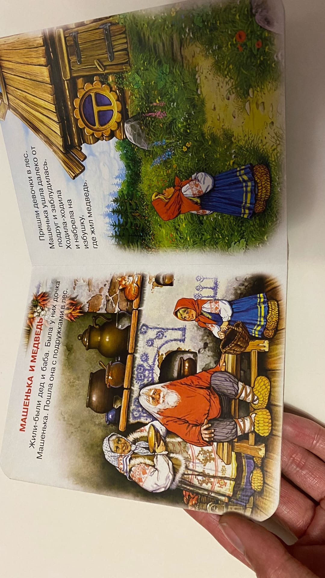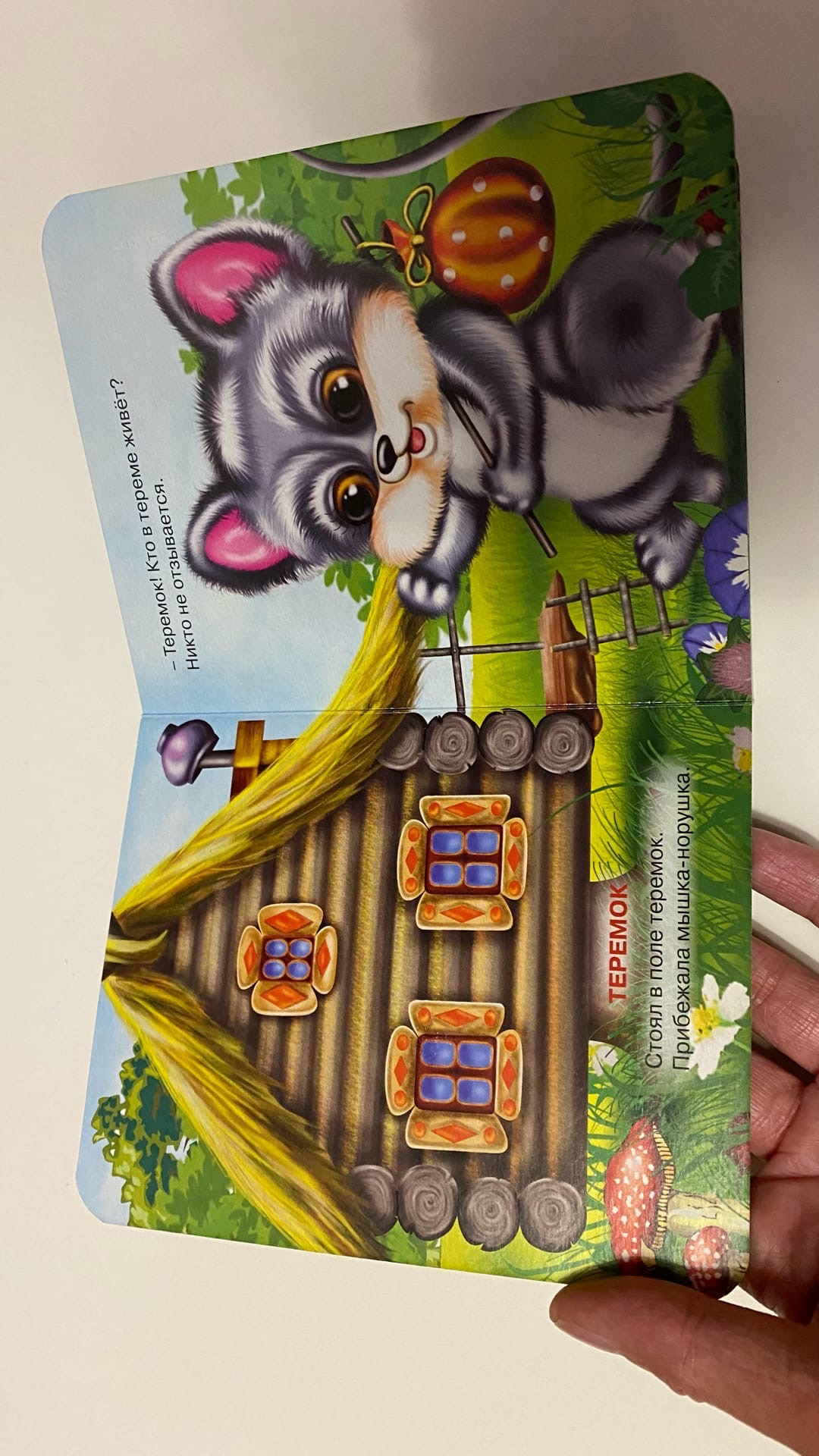 Эту книгу удобно брать с собой в дорогу или туда. Где надо ждать с ребенком очередь. Книжка помещается в маленькую сумку. Дочка любит сама эту книгу листать и смотреть картинки. Вроде одни плюсы. Но есть и минусы. Это то, что, например, в сказке "Теремок" не дописаны предложения. Мышка теремок увидела, и не написали, что она стала в нем жить. Это предложение опустили, что, мне кажется, неверным.