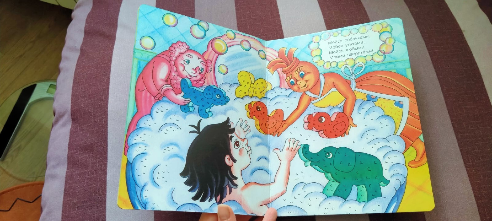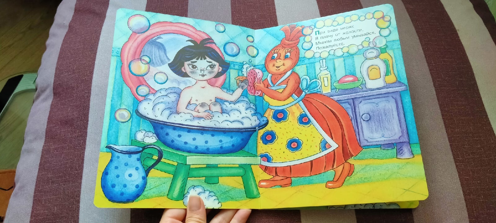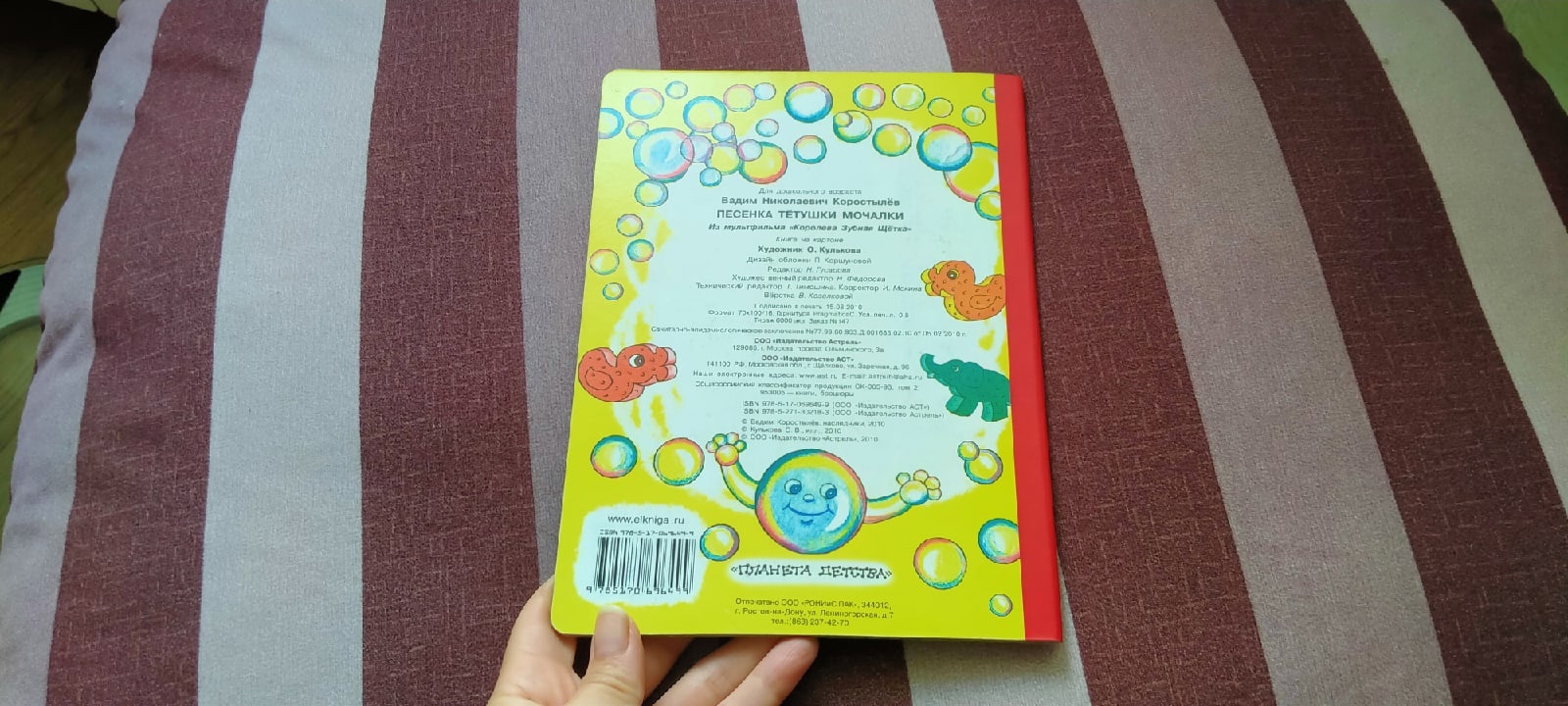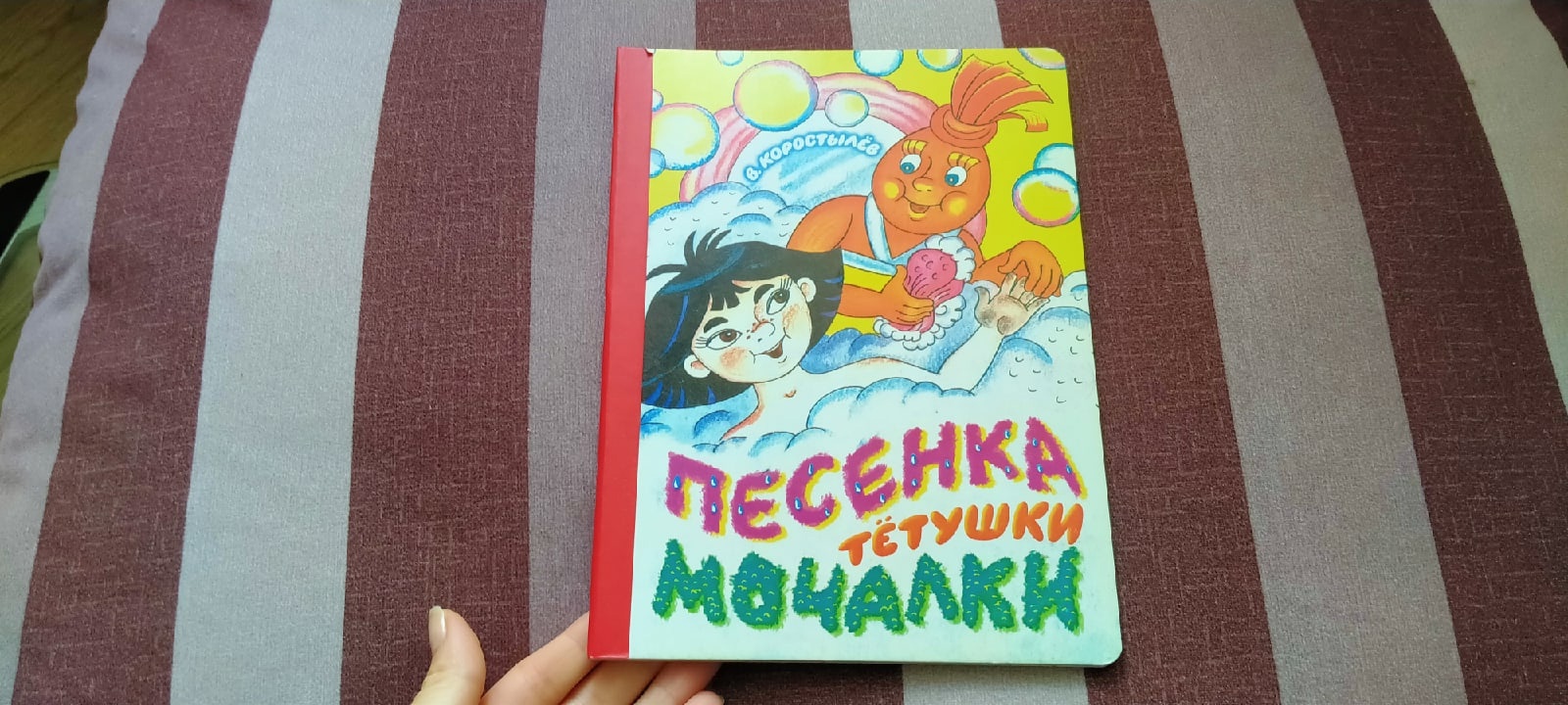 Книга «Песенка тетушки мочалки» (автора В.Коростылёва, художника О.Кульковой, издательства ООО «Издательство Астрель») моих детей немного разочаровала. Да, твёрдые плотные странички, которые может листать малыш самостоятельно, не боясь порвать. Да, удобный формат а5, можно брать и в дорогу, не сильно большая, но и дома можно читать. Да, картинка на каждом развороте.