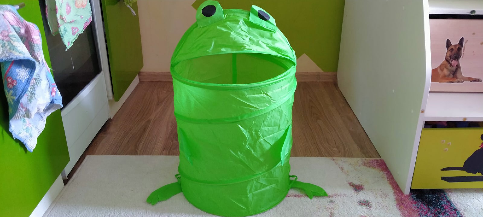 Корзину для хранения игрушек "Лягушка" мы используем как корзину для грязного белья. Очень удобно, и детям нравится. Дети сами складывают туда свою грязную одежду (как будто кормят лягушонка, для них это как игра). А такая игра также помогает наводить порядок и учит ответственности, приучает детей к домашнему труду.