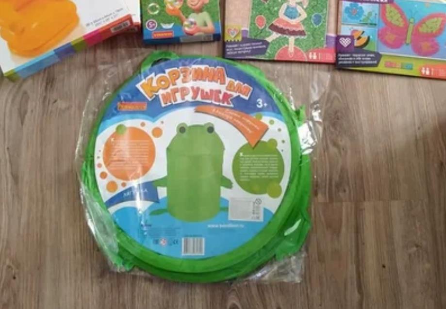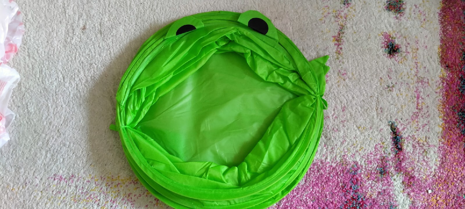 Крышка корзины (в виде головы лягушки с глазками) открывается и закрывается (что очень нравится детям). На самой корзине расположены 4 лапки, что дополняет образ лягушки.