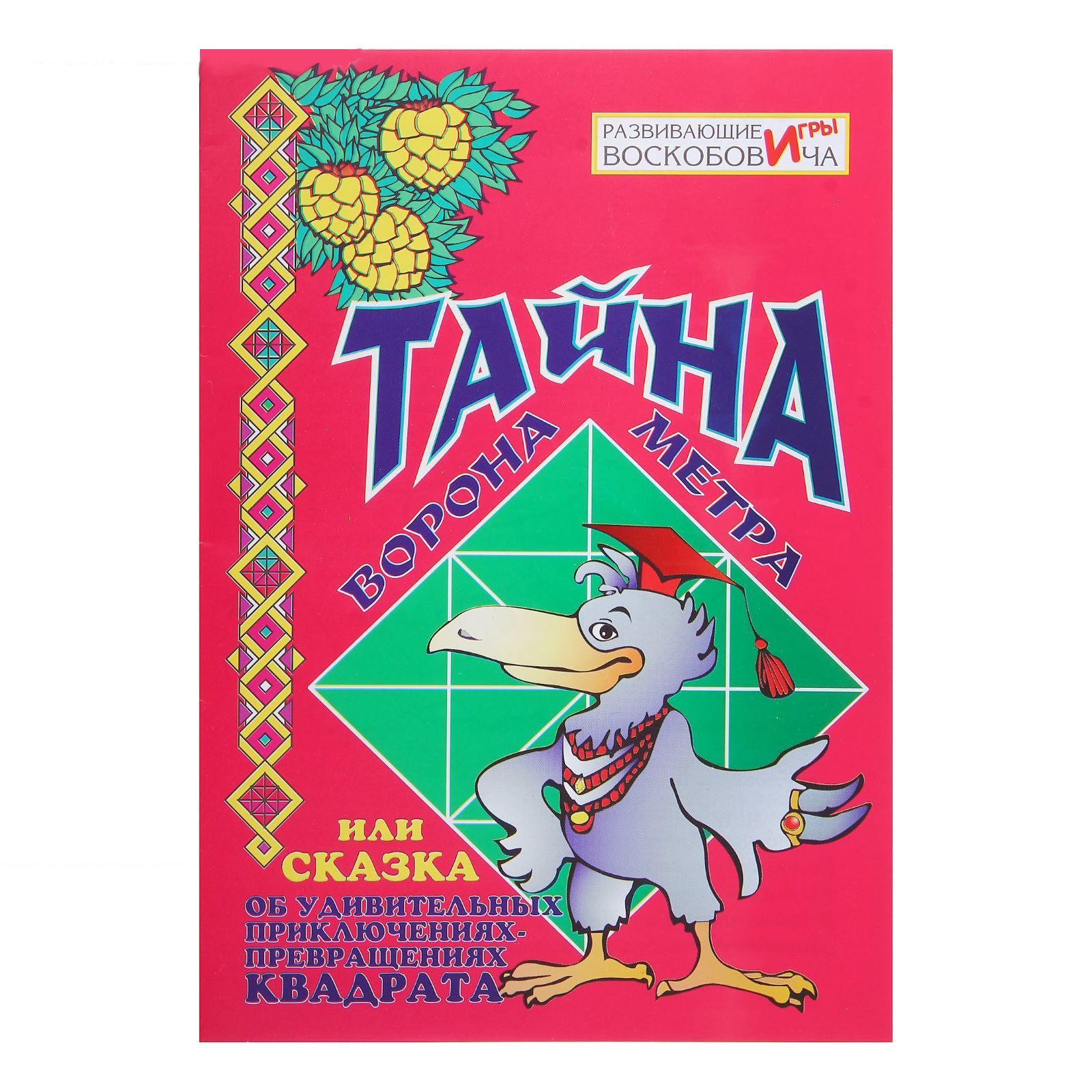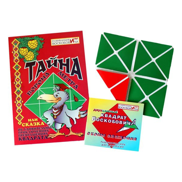 В комплект «Квадрат Воскобовича двухцветный» входят описанный выше квадрат на тканевой основе, инструкция со схемами складывания фигур и сказочное повествование «Тайна Ворона Метра, или сказка об удивительных превращениях-приключениях квадрата». Цветовое контрастное сочетание составляющих квадрат треугольников и ткани, на которую они прикреплены, позволяет легко выделять геометрические фигуры с помощью зрения, а также по-разному группировать треугольники в квадраты, треугольники и прямоугольники разной величины. Узнавая эти геометрические фигуры, ребёнок с удовольствием составит с помощью схемы образы башмачка, вороны, домика, ёжика, звёздочки; конфеты, котёнка, летучей мыши и другие, в которые превращается в сказке удивительный Квадрат.