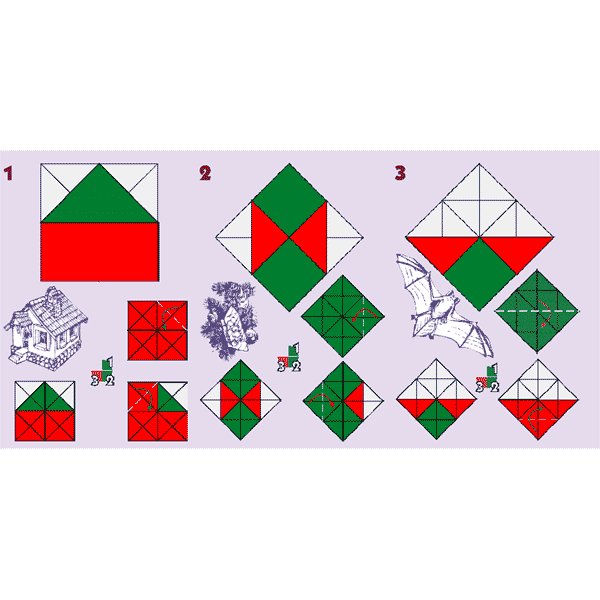 Благодаря тому, что все треугольники находятся на одинаковом расстоянии друг от друга и не соприкасаются сторонами, создаётся картина целостной цветной фигуры – квадрата, разделённого на составные части полосками ткани белого цвета. Такое конструктивное решение позволяет складывать большой квадрат и получать знакомые плоские фигуры, а также преобразовывать их в объёмные фигуры. Конечный результат своей деятельности малыш получает очень быстро, все образуемые фигуры имеют чёткие очертания, и в этом принципиальное отличие от работы в технике оригами с бумагой.