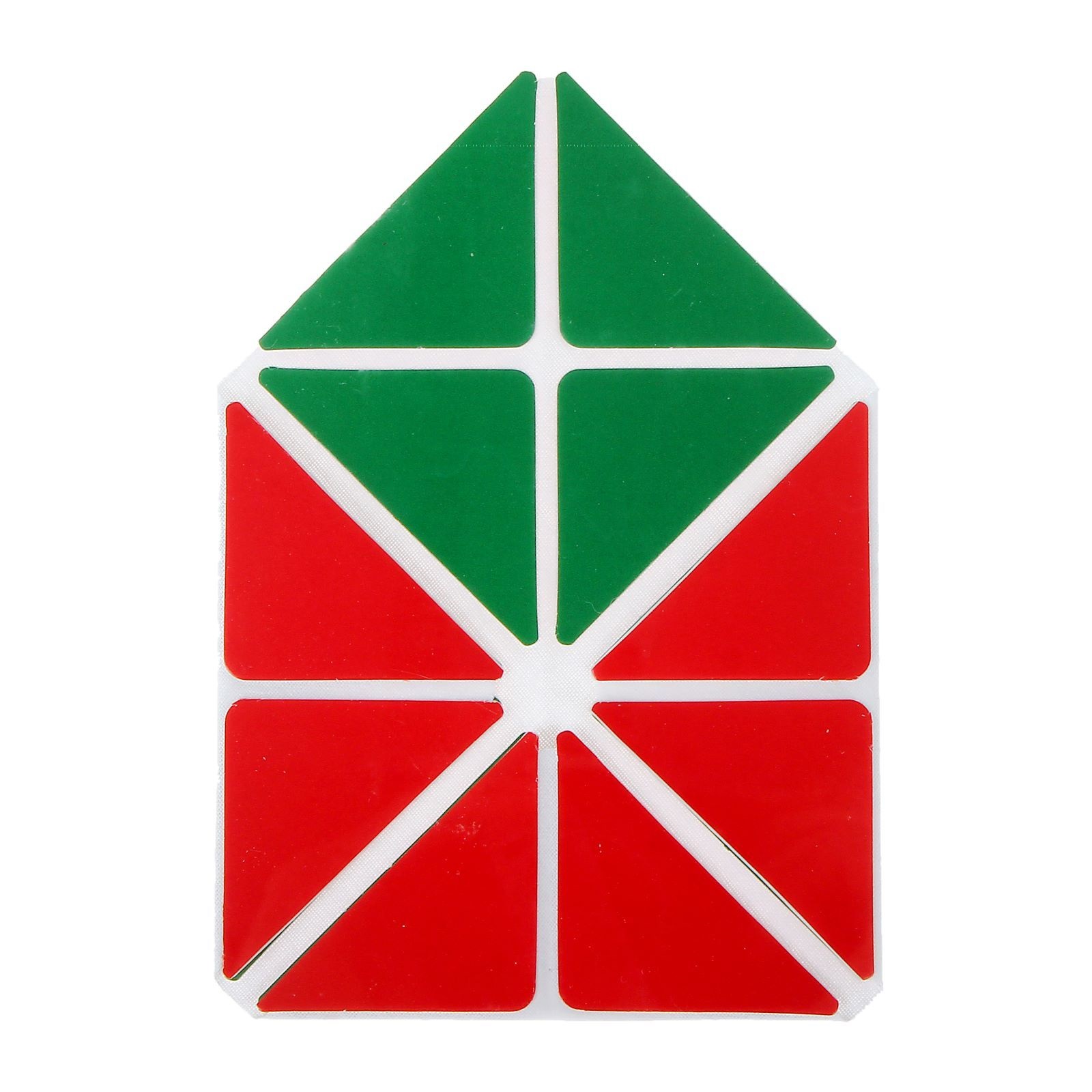 На тканевую квадрата с одной стороны прочно приклеены 16 прямоугольных треугольников красного цвета, с другой стороны – 16 таких же по форме треугольников зелёного (или жёлтого) цвета. Прямоугольники расположены так, что внутри большого квадрата размером 14 х 14 см они составляют 4 одинаковых квадрата размером 7 х 7 см. В каждом из 4-х таких квадратов треугольники повёрнуты друг к другу катетами, таким образом, сторона большого квадрата составлена гипотенузами двух квадратов.
