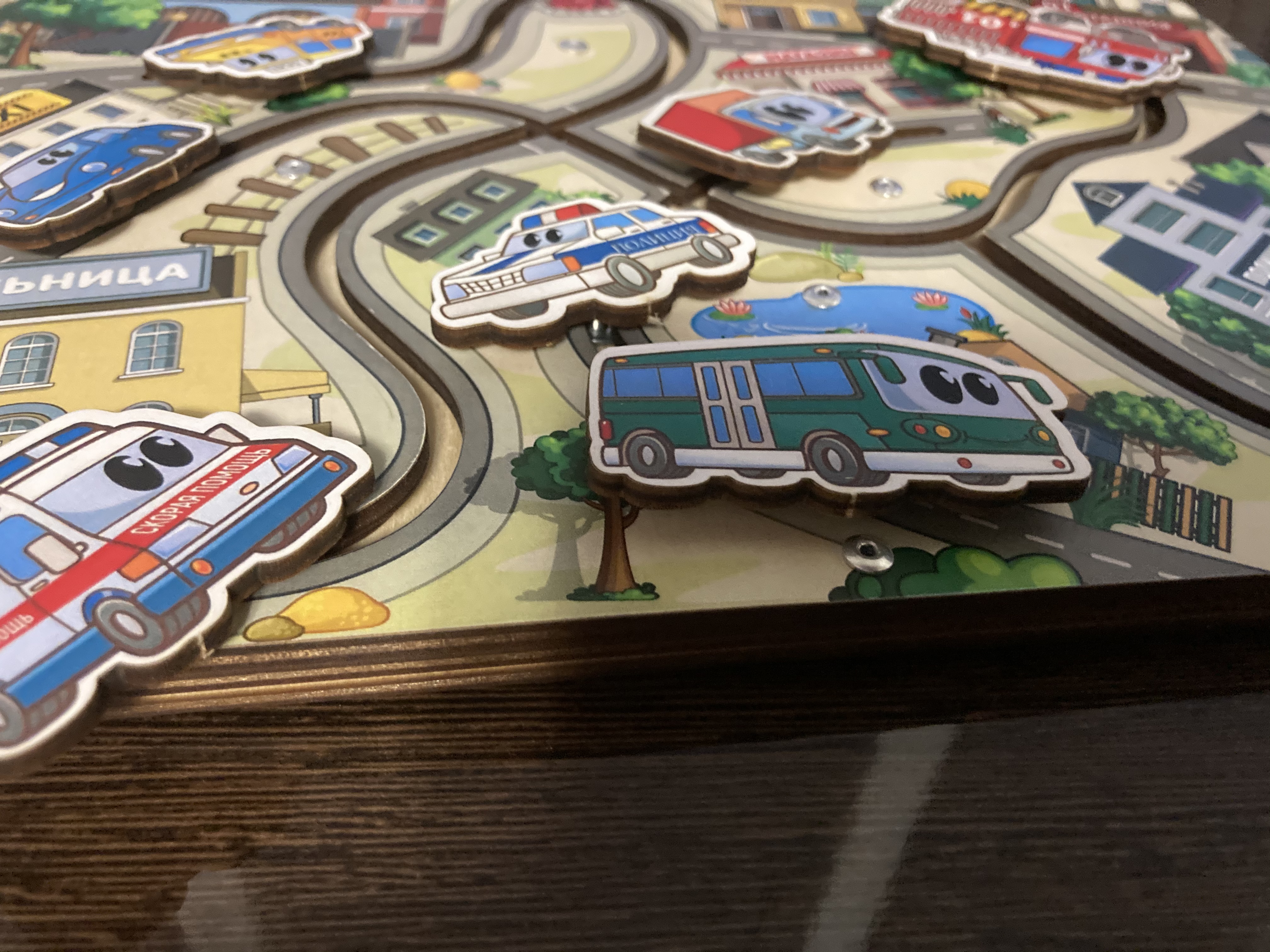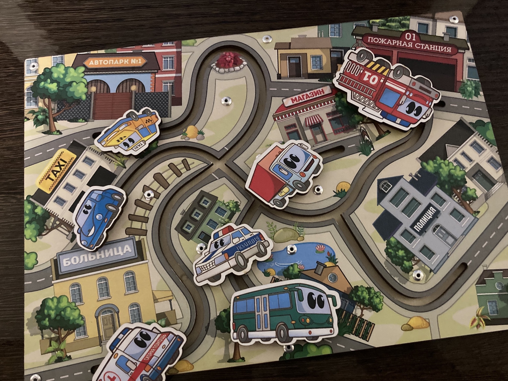 Хочется отметить, что когда я взяла в руки лабиринт, сразу стало понятно, что игрушка сделана с любовью и трепетом, каждый элемент выполнен идеально. Изображение города - это нанесенный рисунок отличного качества. Задача ребенка состоит в том, чтобы отправить каждую спец.машину в свой гараж.