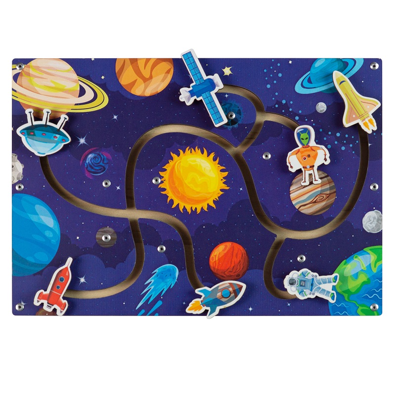 Лабиринт-пара «Космос» представляет собой планшет из натурального дерева с напечатанными изображениями космического пространства и семью двигающимися штангами в форме астронавта, ракеты, космического корабля, инопланетянина, самолёта, спутника, космической станции и планет разных цветов. Все эти фигуры ребенок может передвигать по имеющимся дорожкам на деревянном планшете. Игра будет увлекательной и занимательной для детей дошкольного и младшего школьного возраст. Разработана и произведена игра российским производителем игрушек из нетоксичных высококачественных материалов. В процессе занятия у мальчиков и девочек развивается пространственная координация и восприятие, мелкая моторика рук и пальцев, мышление, внимание, память, кругозор, речь, пополняется словарный запас. Если с ребёнком параллельно вести обучающие и развивающие беседы, то в конце игры он сможет запомнить все названия планет и познакомится с основными понятиями темы «о космосе».