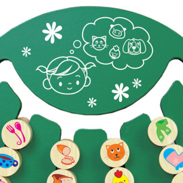 - Найди слово со звуком. Малышу необходимо поместить в одну из длинных прорезей фишки с картинками, в названиях которых есть заданный звук. Например, выделив звук "о", ребёнок группирует фишки с изображением ложки, кота, щенка.