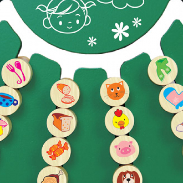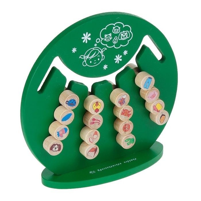 В состав набора входит: игровое поле, подставка для его крепления и фишки (16 шт.). Поле круглой формы имеет шесть прорезей в виде канавок разной протяжённости. Они предназначены для перемещения фишек во время игры. Две короткие прорези выполняют вспомогательные функции и нужны для маневрирования фишками при их группировке, а четыре длинные служат для размещения уже сгруппированных фишек. В собранном виде фишки имеют цилиндрическую форму с проточкой по внешней поверхности на середине длины. С одной торцевой стороны каждой фишки размещена предметная картинка с изображением домашнего животного или продукта питания, столовых приборов, предметов посуды, обуви, одежды. С другой стороны представлены цифры от 1-го до 16-и. Круглая подставка необходима для закрепления игрового поля в вертикальной плоскости и обеспечения устойчивости игрушки.