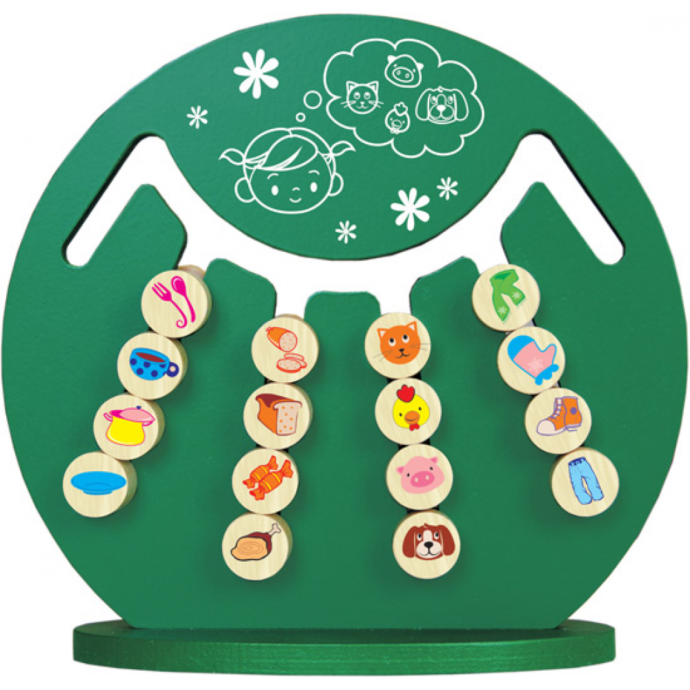 посуда, одежда и обувь). Двигая элементы по прорезям нужно составить логическую