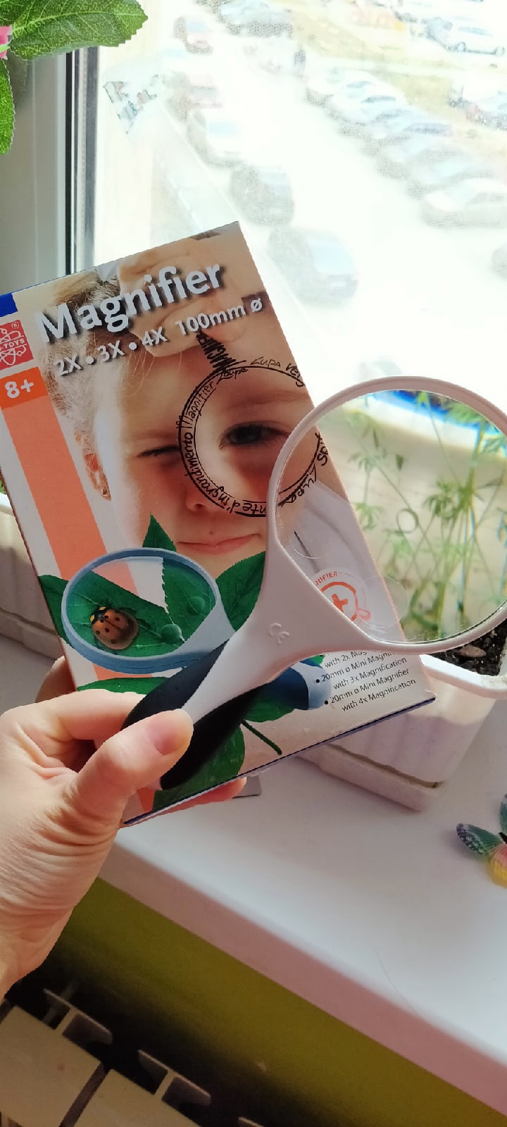 Лупа шикарная! Ручка с прорезиненными вставками, за счет чего лупу держать в руке очень удобно и комфортно, она не выскальзывает из руки (хотя сама по себе достаточно тяжеловатая). Основное стекло на лупе увеличивает в два раза. Внизу основного стекла лупы есть два дополнительных стеклышка, одно из них увеличивает в 3 раза, второе - в 4 раза. Очень удобно, не нужно иметь несколько луп, здесь 3 в 1 получается. Хотелось бы отдельно обратить внимание на качество стекла. Мои малыши неаккуратные. Предыдущие лупы все портились за считанные дни. Здесь же почти нет царапин. Пользуемся уже несколько месяцев. Пластик плотный, стекло лупы не выпадает и даже не шатается. Лупа упакована в удобную плотную коробку, в которой и храним, очень удобно.
