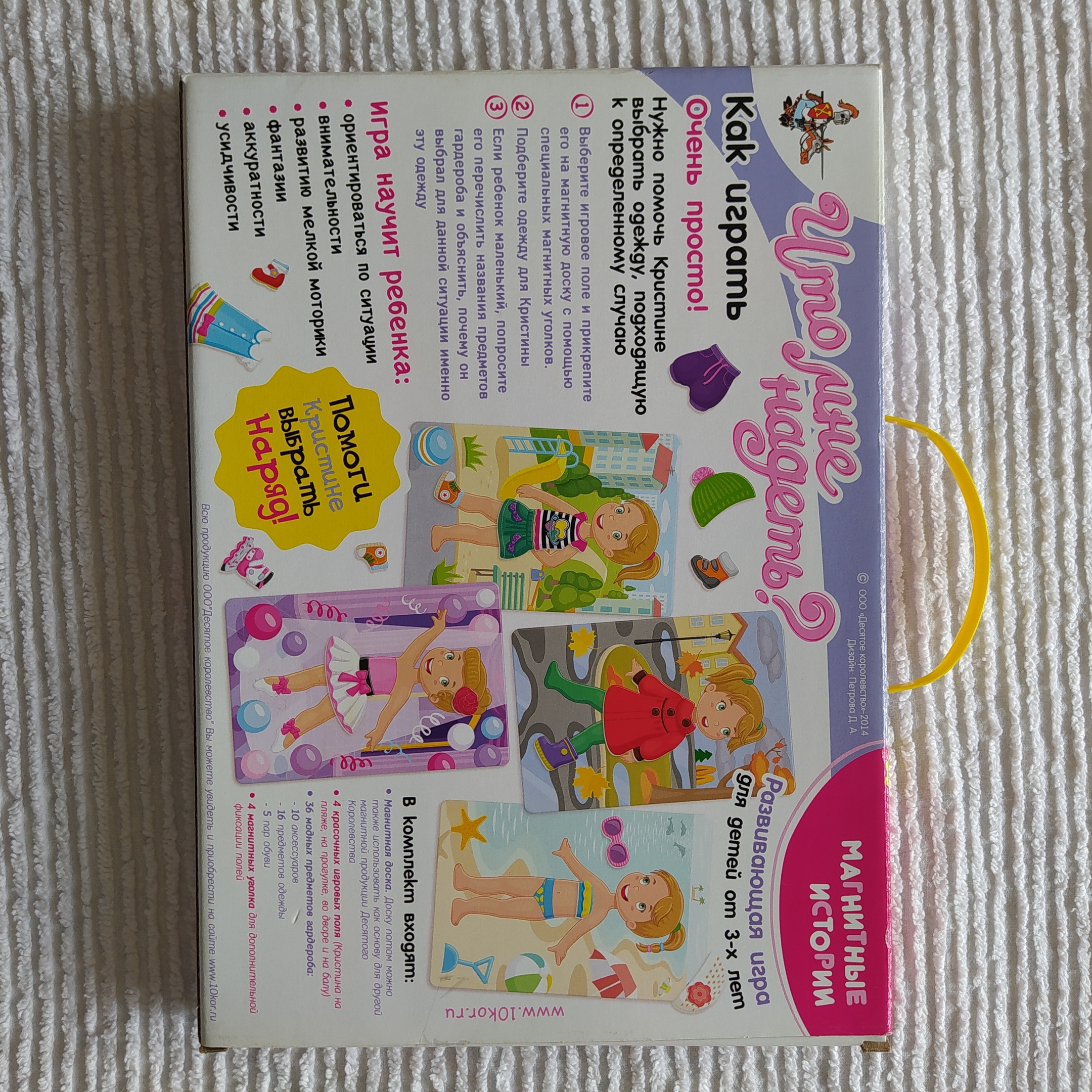 Магнитные истории “Что мне надеть?” - это набор для развития воображения и творческого мышления у детей. В наборе есть магнитные персонажи, которые можно комбинировать между собой, создавая различные истории. Каждая история имеет свою тему, например, “День рождения”, “Путешествие”, “Новый год” и т.д. В каждой истории есть несколько персонажей, которые нужно подобрать друг к другу. Например, если история “День рождения”, то нужно выбрать персонажа, который будет именинником, а также гостей и украшения для стола. Магнитные истории “Что мне надеть?” помогают развивать фантазию, креативность и умение решать проблемы. Они также могут быть использованы для обучения детей правилам этикета и хорошим манерам. Яркая красочная игра поможет малышу изучить названия одежды, подобрать предметы гардероба по ситуации.