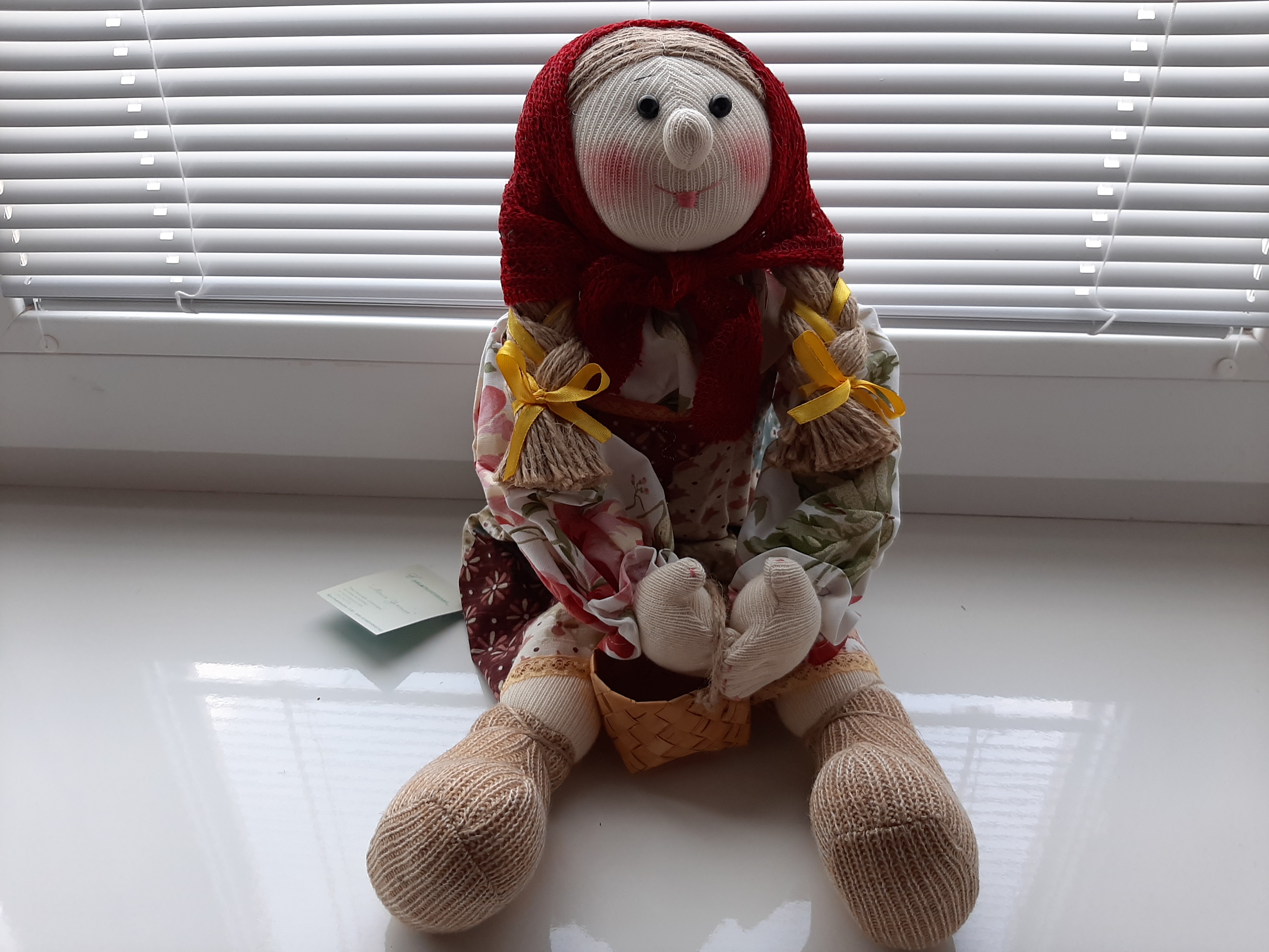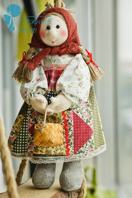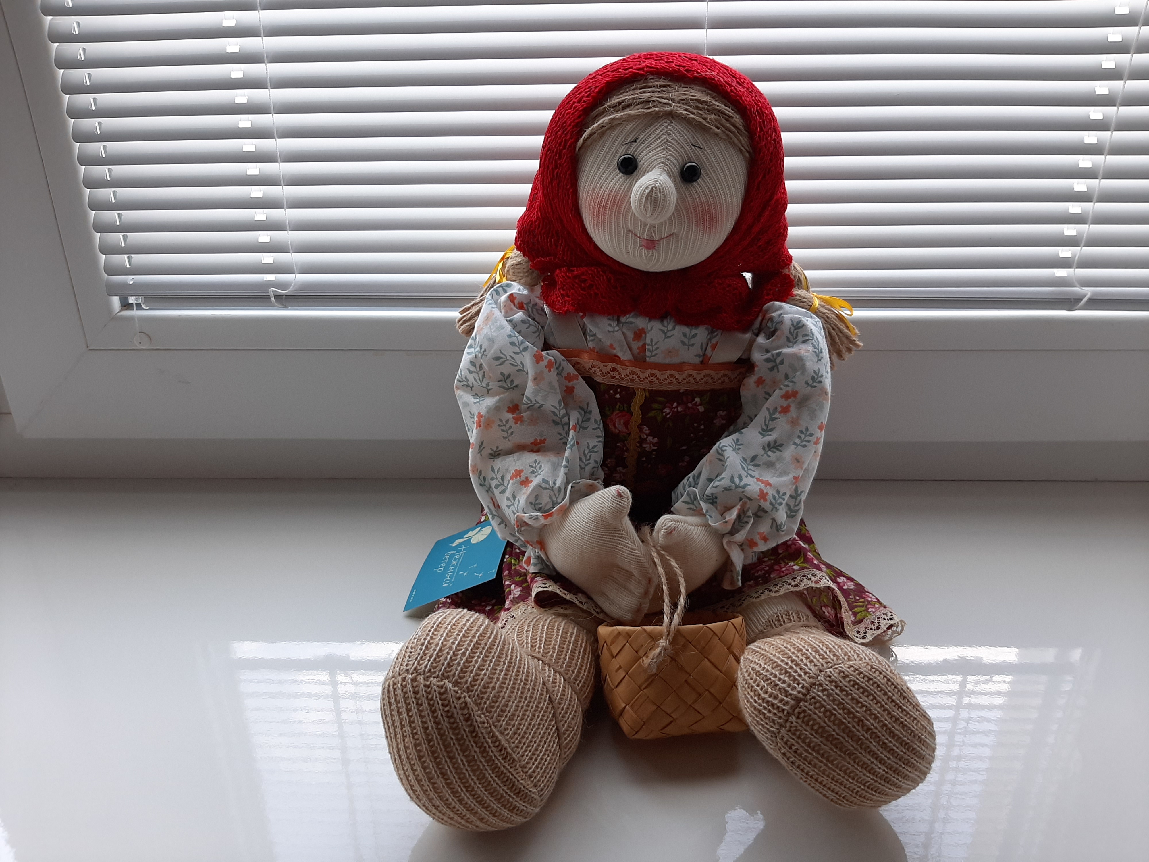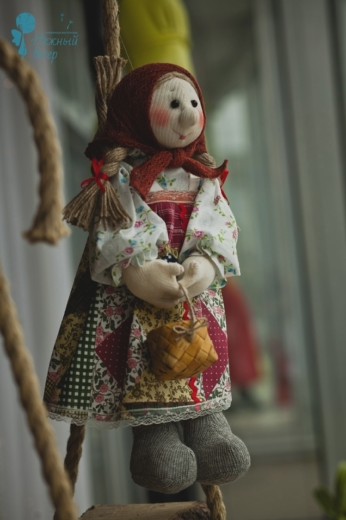 Кукла подвесная. Если садить, надо подпорку для спинки. Машу-умницу любят покупать для кукольных спектаклей, как домашних, так и профессиональных. Кукла ростом ок. 45 см. Парик-косы - из натуральной пеньковой декоративной "веревки". Корзинка - ручное плетение, лоза. При заказе уточняйте цвет сарафана, возможно расхождение с фотографией.