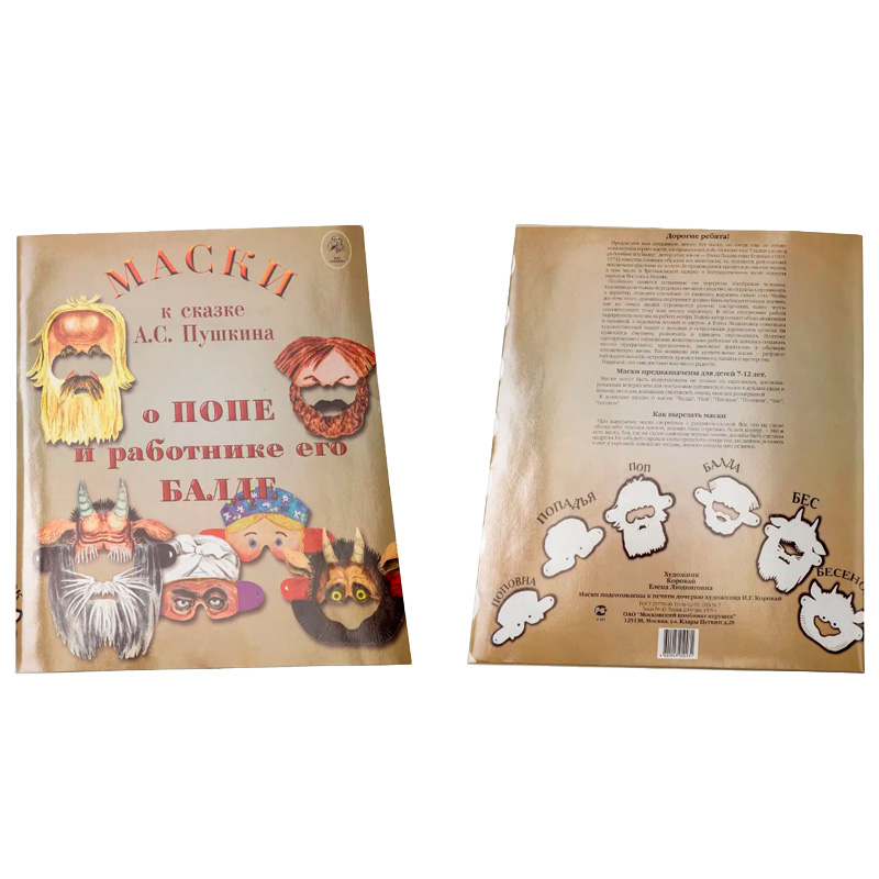 Набор масок к сказке «О попе и о работнике его Балде пригодится, если ваш ребёнок готовится пойти на костюмированную вечеринку, карнавал или детский утренник в школе или в саду, а также понравится детям, кто любит устраивать театральные представления дома для родных и друзей. Комплект масок может быть использован в школе на уроке чтения или литературы при изучении произведений Пушкина, чтобы мальчики и девочки нагляднее изучили сказку. Все маски изготовлены на основе масок, созданных художником Коровай Е.Ю., чьи работы выставлены в Третьяковской Галереи и других музеях. Маски изготовлены из высококачественной бумаги, окрашены нетоксичными красками на водной основе и упакованы в картонную папку.