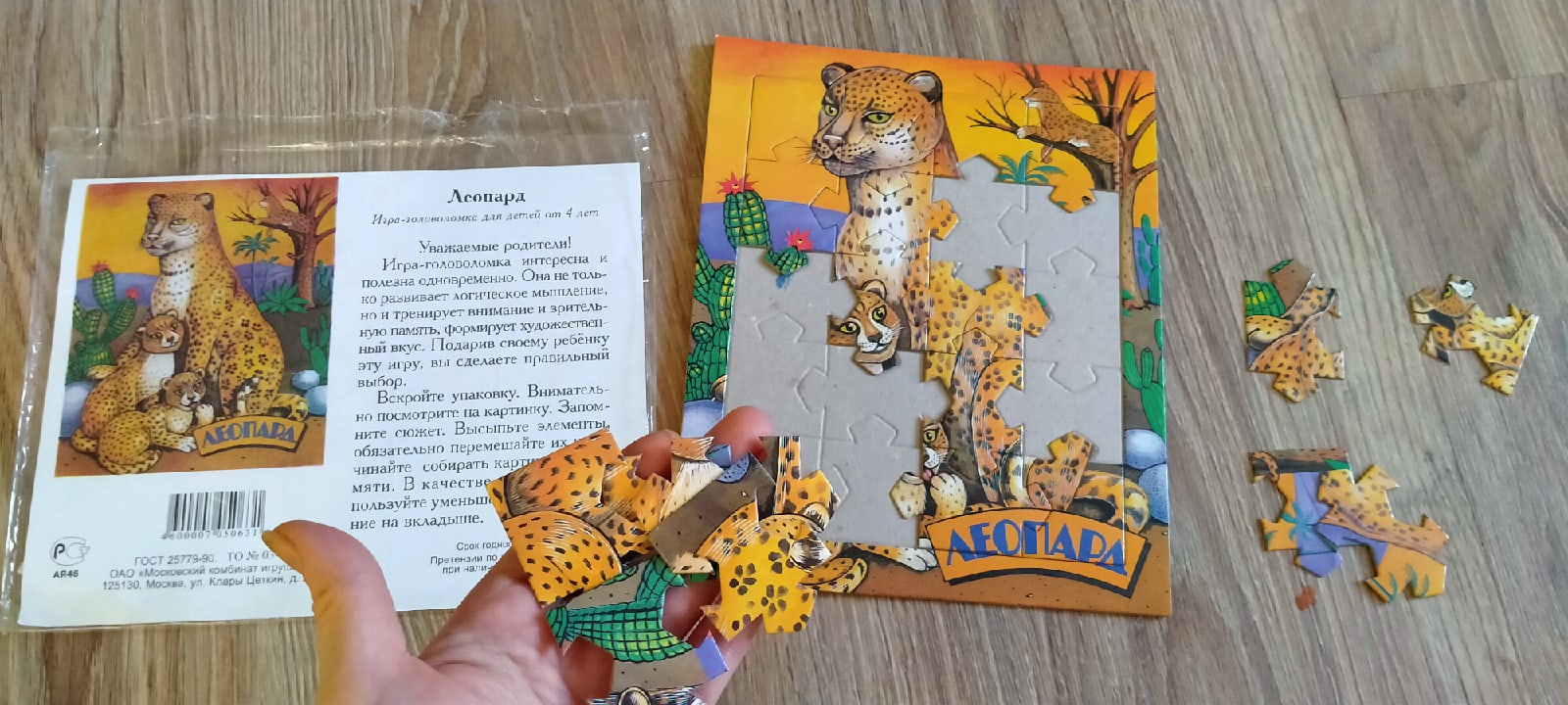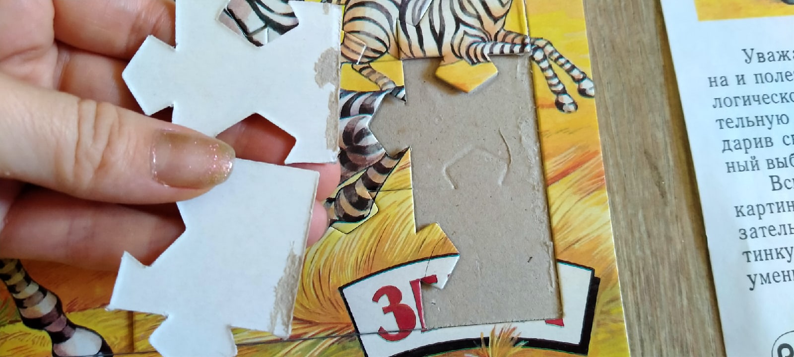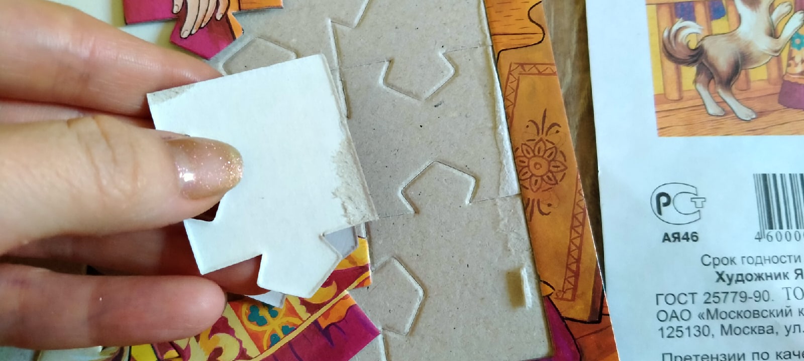 Производитель рекомендует сначала внимательно посмотреть на картинку, запомнить ее, а затем высыпать элементы и по памяти собрать картинку. Если вдруг у ребенка возникнут сложности в сборке по памяти - не беда! В комплекте есть картинка-образец. Пазлы сделаны из картона. Основа достаточно плотная, а сами детали пазла потоньше. Когда пытались вытащить детали из основы, некоторые детали были приклеены к основе по краям, мы аккуратненько их отрывали, но следы все равно остались.