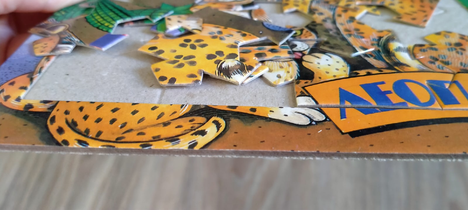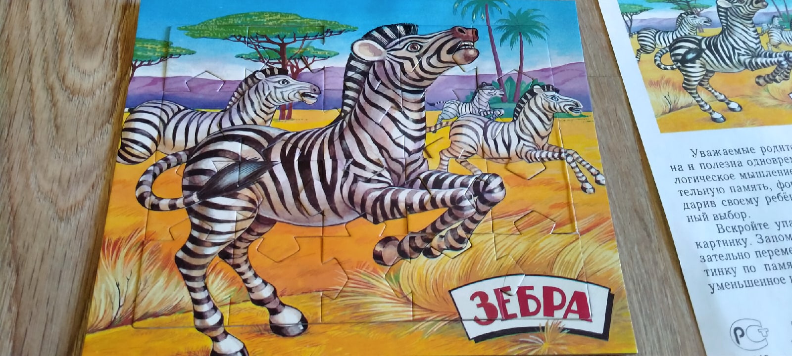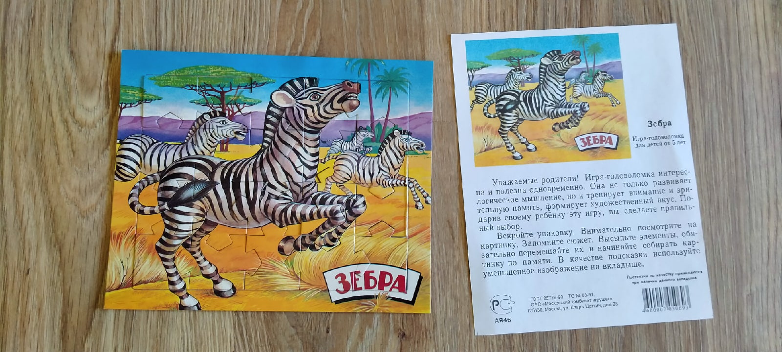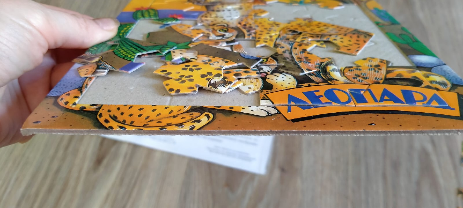Производитель рекомендует сначала внимательно посмотреть на картинку, запомнить ее, а затем высыпать элементы и по памяти собрать картинку. Если вдруг у ребенка возникнут сложности в сборке по памяти - не беда! В комплекте есть картинка-образец. Пазлы сделаны из картона. Основа достаточно плотная, а сами детали пазла потоньше. Когда пытались вытащить детали из основы, некоторые детали были приклеены к основе по краям, мы аккуратненько их отрывали, но следы все равно остались.