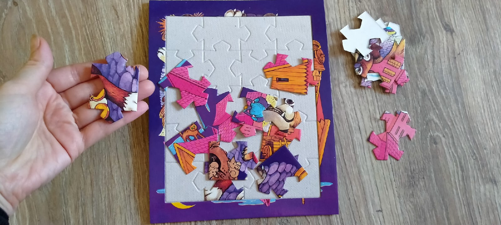 Очень важно, чтобы ребёнок почувствовал себя способным собрать рисунок своими силами. Для этого изображение заключено в рамку. С ней подобрать подходящие детали будет намного легче. В игре с пазлами важен не только сам процесс, но и результат. Пусть малыш отгадает, какая именно сказка изображена на рисунке, какой момент истории. Это поможет ему вспомнить весь сюжет целиком, и он сможет рассказать вам, что именно он вспомнил. Пересказывание прочитанного или услышанного очень полезно для развития речевых навыков и обогащения словарного запаса.