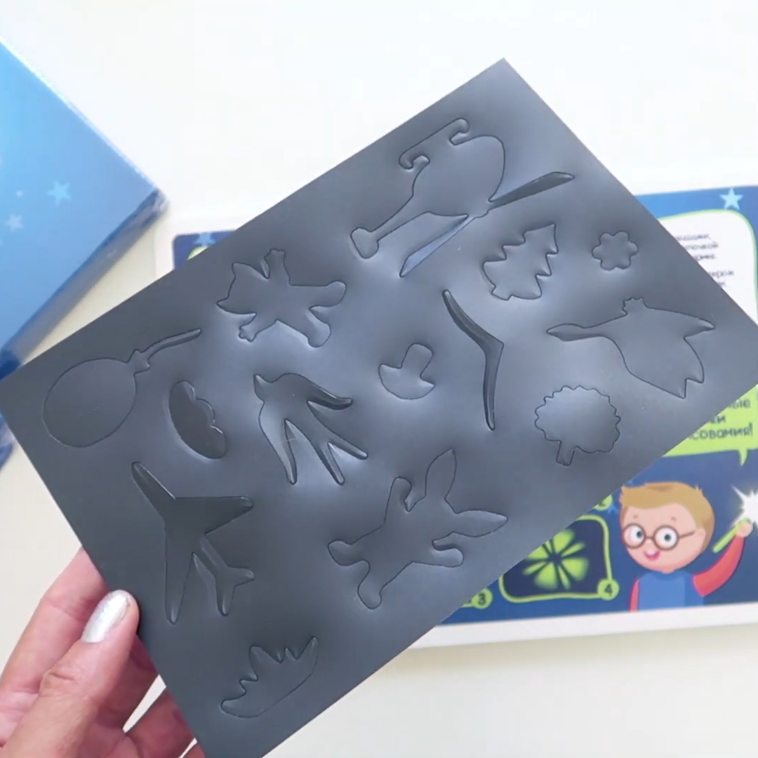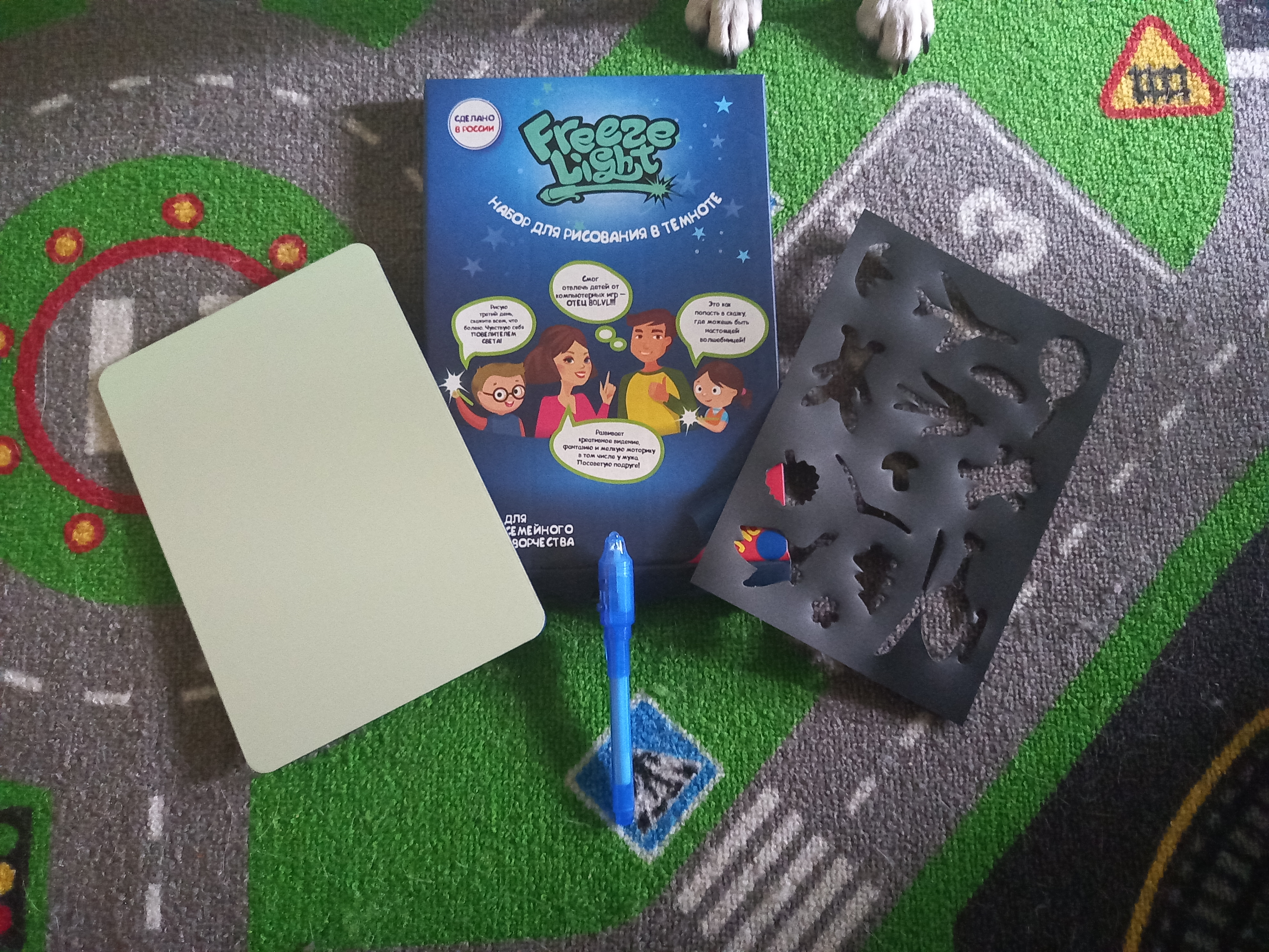 Что понравилось - богатая комплектация. В наборе есть приятный сюрприз в виде нескольких звездочек наклеек, которые светятся в темноте. А так же есть запасные батарейки для ручки, за что отдельное спасибо! Так же в набор входят трафареты, доска, плотная и толстая.