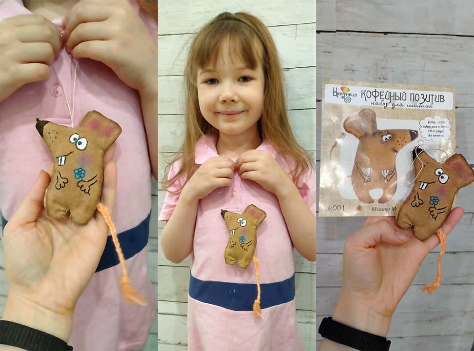 Заказывали этот набор "Мышка" от ТМ "Цветница" на сайте "Игры и игрушки". Доставка была быстрой, а сам набор - просто чудо! Делали игрушку вместе с моей шестилетней дочерью. Я ей немного помогала, сама она не справлялась. В комплекте есть всеё необходимое для изготовления очень симпатичной мягкой игрушки с очень вкусным запахом кофе (кроме набивки, набивку нужно приобрести отдельно).
