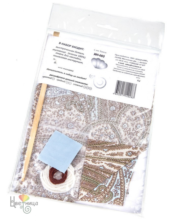 В наборе: выстроченные детали туловища, ткань и выкройка для остальных деталей- хлопок 100%, нитки мулине, пряжа, инструмент для выворачивания, инструкция по пошиву. Наполнитель для набивки в набор не входит.