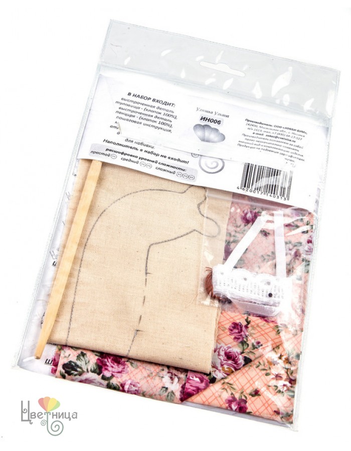Оригинальное изделие для подарка или декора комнаты получится благодаря усидчивости, вниманию и аккуратности девочки. В начале работы необходимо вырезать основные детали туловища, которые уже прошиты по всему контуру. После этого вывернуть и заполнить части наполнителем с последующим зашиванием отверстий. Готовые элементы соединяем между собой. Затем приступить к раскрою и шитью одежды. Добавляем контуры мордочки (глаза, улыбку). Готовую игрушку можно дополнить элементами декора. Российская ТМ «Цветница» предлагает также другие творческие наборы по изготовлению мягких игрушек.