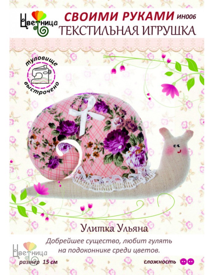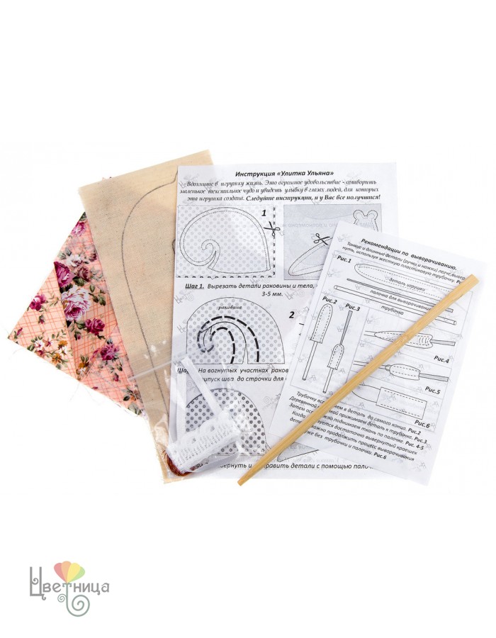 Увлекательный набор для шитья «Улитка Ульяна» рекомендован девочкам в возрасте от восьми лет и старше для создания текстильной игрушки своими руками. Комплект включает в себя: заранее выстроченные детали туловища из 100% хлопчатобумажной ткани; украшения в виде атласной ленты, бусин, кружева; инструмент (деревянная палочка) для осуществления выворачивания готовой заготовки; подробная пошаговая инструкция по пошиву с демонстрационными картинками. Размер готового изделия 15 см. Внимание! Набивной материал в набор не входит (можно использовать синтепон или холофайбер). Для работы дополнительно понадобятся ножницы, иголка и нитки.