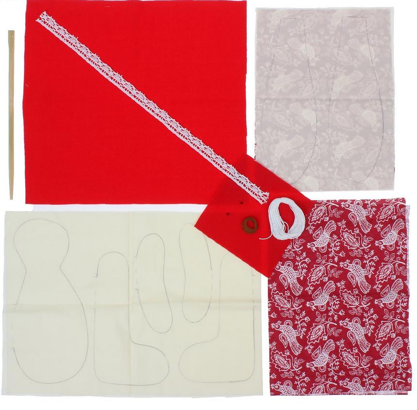 В наборе: выстроченные детали туловища, ткань и выкройка для одежды - хлопок 100% и флис, нитки мулине, бусины, нитки "ирис", кружево, инструмент для выворачивания, инструкция по пошиву.