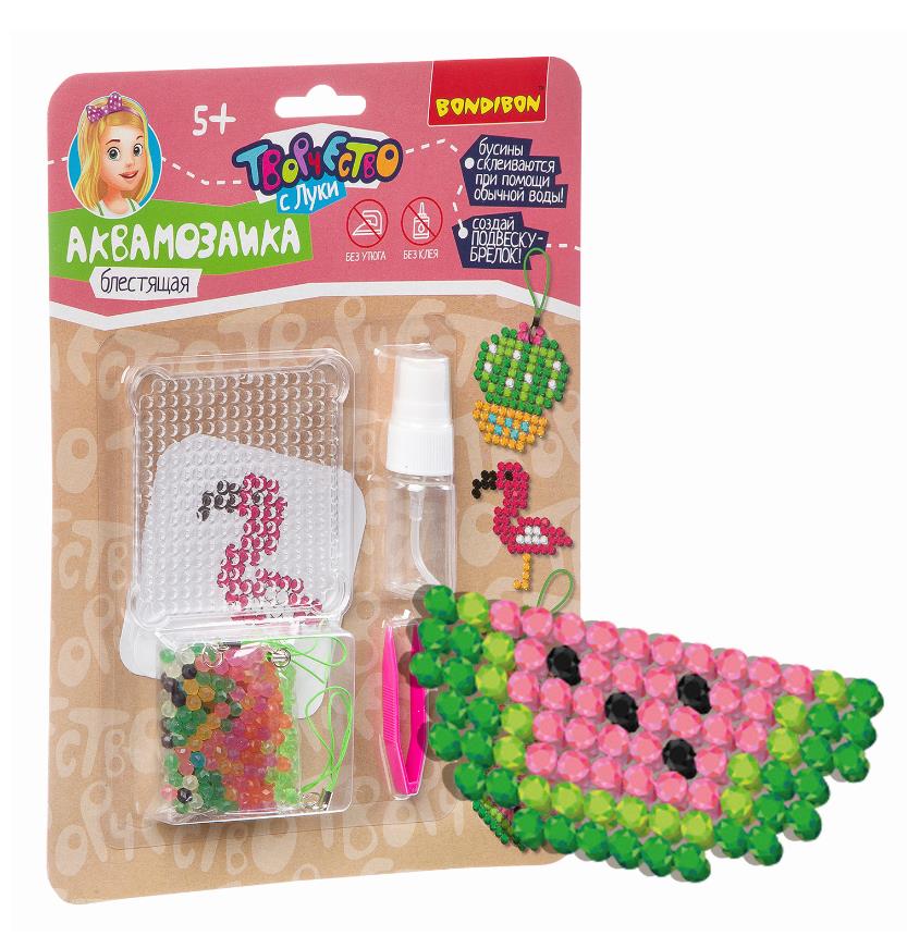 Набор для творчества "Аквамозаика" от компании Bondibon включает в себя специальный прозрачный пластиковый станок с небольшими ячейками, белый пластиковый пинцет, миниатюрный флакон (примерно 10мл) с пульверизатором, четыре бумажные схемы и набор бусин в полиэтиленовом запаянном пакетике.