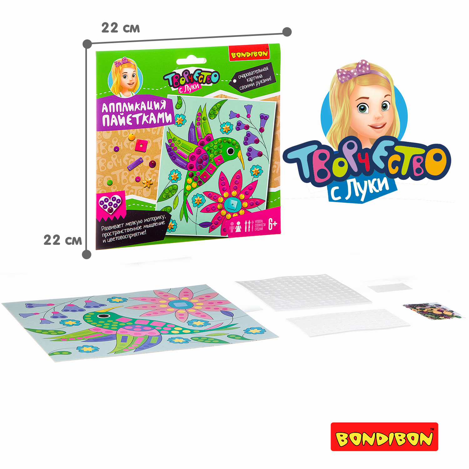 Набор включает в себя карту - основу с ярким рисунком, которую необходимо дополнить и украсить сочетанием разноцветных пайеток, закрепив их на основе с помощью объемного двустороннего скотча. В процессе работы развивается мелкая моторика, концентрация внимания, творческое мышление