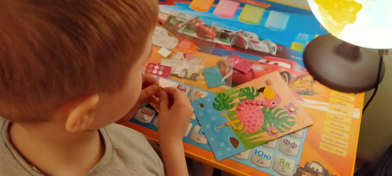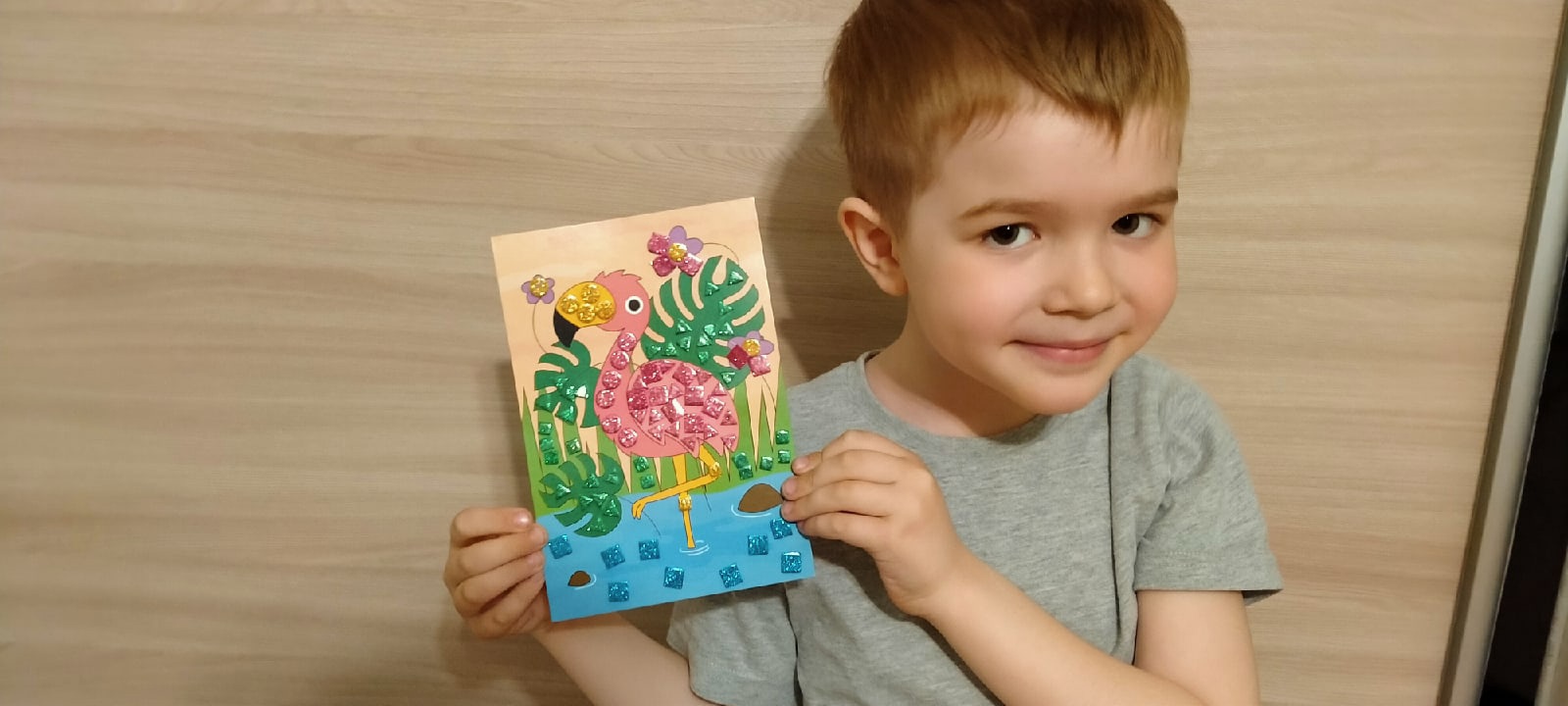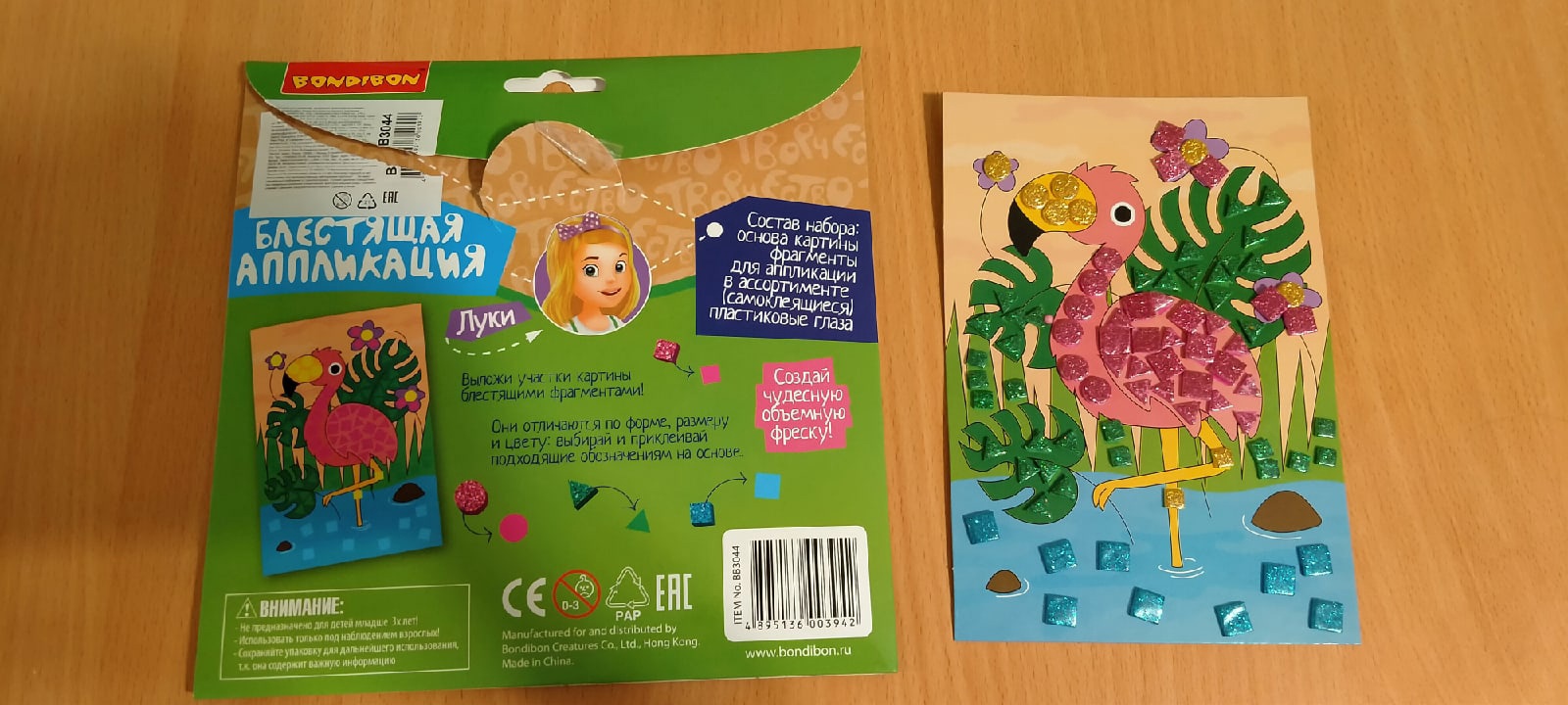 Эта блестящая аппликация по заявлению производителя рассчитана на девочек старше 6 лет. Но почему для девочек? У меня 5-летний сын вот с удовольствием клеил эту блестящую аппликацию с изображением розового фламинго. Ладно он ещё не понимает обозначения на упаковке, если бы увидел, что набор для девочек, то, наверное, расстроился бы. В их возрасте для мальчиков или девочек сильно акцентируется.