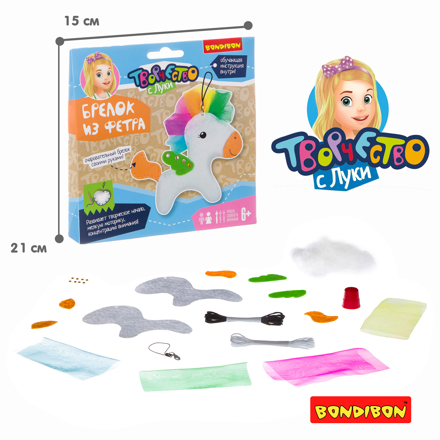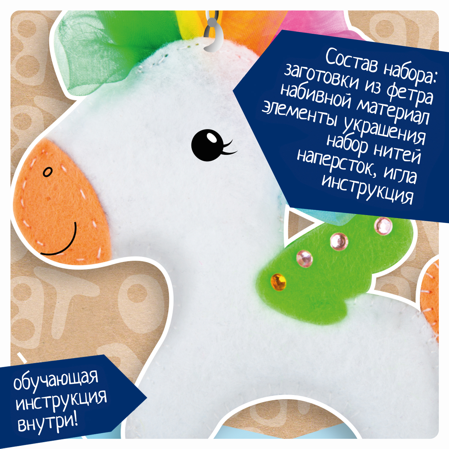Состав набора: заготовки из фетра, набивной материал, элементы украшения, набор нитей, игла, наперсток, инструкция.