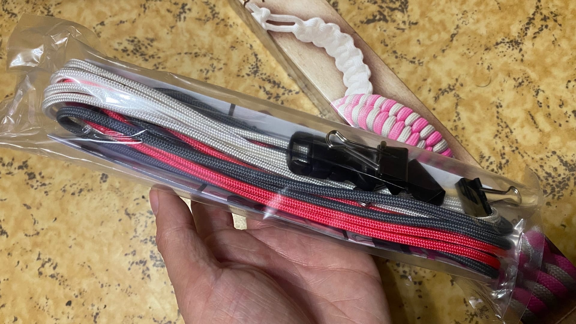 Внутри набора была плотная веревка (толще и плотнее шнурков), лента, карабинчики пластмассовые (большие, как на рюкзаках) и инструкция. Инструкция ясная и понятная, с цветными картинками.