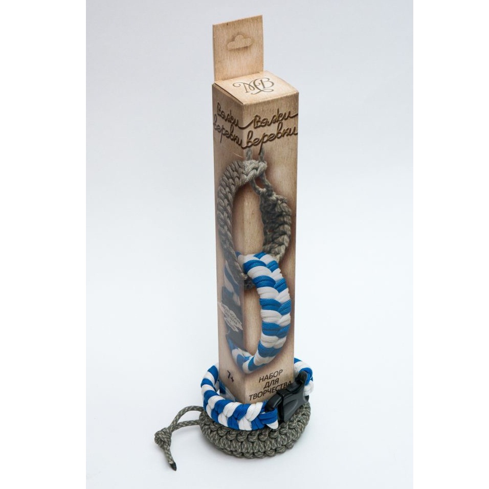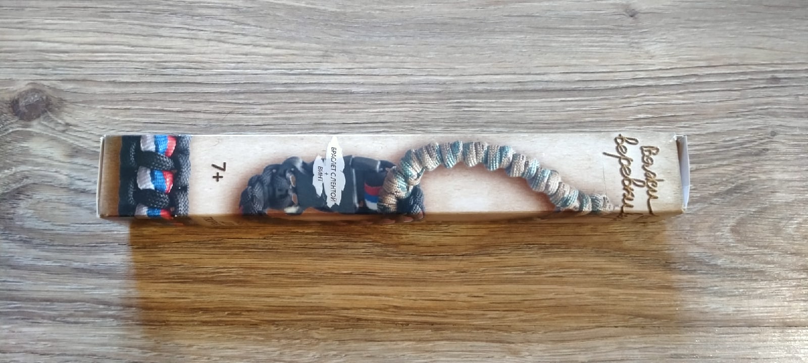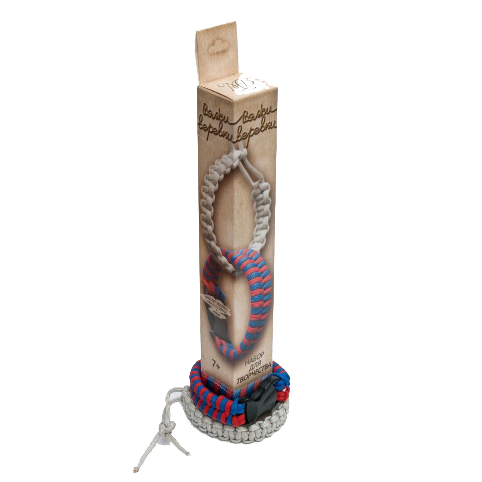 В компактной удобной коробочке вы найдёте: комплект разноцветных нейлоновых шнурков, пластиковый безопасный карабин для будущего браслета, комплект зажимов, направляющая из дерева, цветная иллюстрированная инструкция, в которой подробно описаны схемы и порядок данного вида плетения. Не торопитесь выбрасывать коробочку, она непременно пригодится: во-первых, на ней есть линейка, которая позволяет отмерять нужную длину ниток; во-вторых, коробочка будет служить станком для плетения.