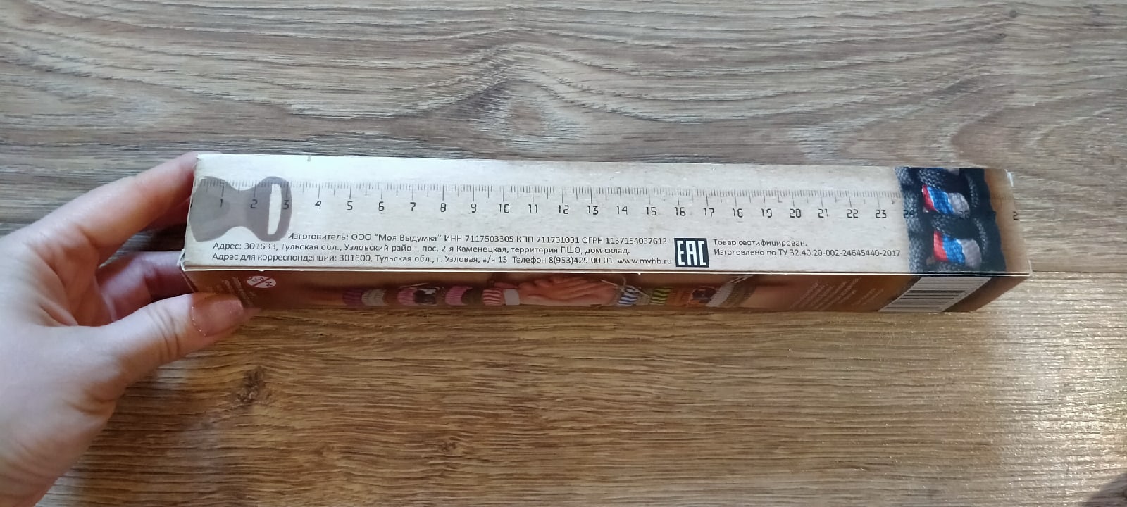 Упакован набор в удобную коробочку, на которой нарисован итоговый результат (браслет), написана краткая информация о наборе, производителе. А на одной из сторон даже есть линейка (спасибо производителю за такой подход, видно, что старались для людей).