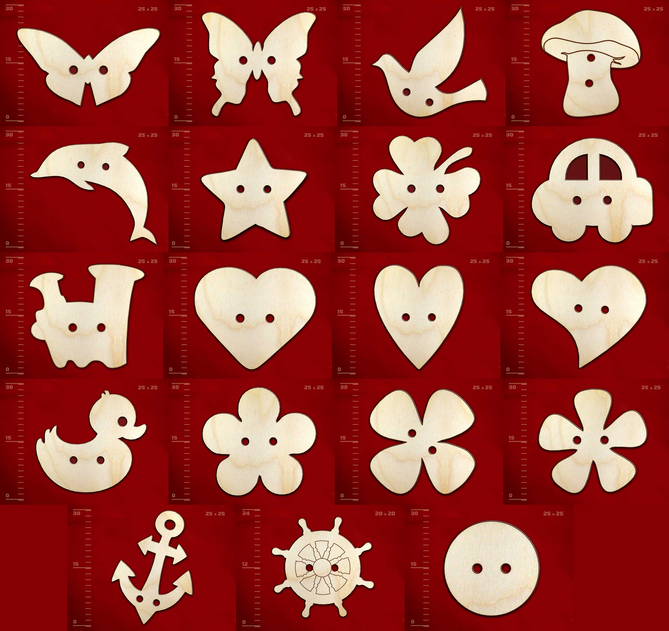 Заготовки для пуговиц сделаны из березовой фанеры, толщиной примерно 3 мм и диаметром 25 мм, круглые не рельефные, имеют два прокола, всего в комплекте 10 шт или 16 шт (зависит от набора). Пуговки находятся внутри деревянной основы размером 9,5 х 9,5 см. Большой диаметр пуговиц позволяет использовать их для творчества детям от трёх лет и старше (3+). Сами пуговицы достаточно просто извлекаются, необходимо немного надавить на элемент и он выскочит из рамки. На такие пуговицы очень удобно наносить рисунок или приклеивать дополнительные декоративные элементы – блёстки, пайетки, стразы; можно задекупажировать пуговки разноцветными салфетками и покрыть лаком; можно нанести дополнительное изображение с помощью выжигательного аппарата. Каждая пуговка будет уникальна и, несомненно, украсит любой предмет гардероба или творческую поделку.