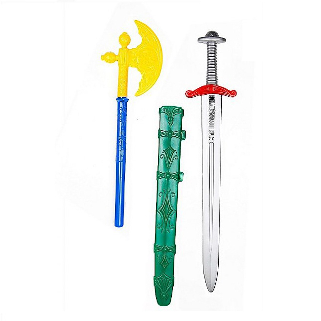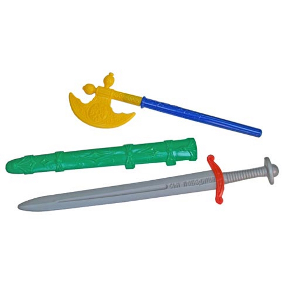 В игровой комплект входит два вида игрушечного оружия – секира с ножнами и меч. Секира – это один из видов холодного рубящего оружия (разновидность боевого топора). Она производиться в двух цветовых сочетаниях: синий – жёлтый и красный – зелёный. Секира имеет лезвие в виде полумесяца и длинную рукоять. По всей длине она украшена объёмными витиеватыми узорами. В длину холодное оружие составляет 45,5 см. Меч – это разновидность холодного оружия, которое имеет прямой клинок и предназначено для нанесения рубящих или колющих ударов. Он имеет длину 57 см, окрашен в серебристый цвет, имитирующий металл, имеет резную рукоятку и объёмную надпись на старославянском языке. Ножны выпускаются в двух цветах (зелёный или чёрный).