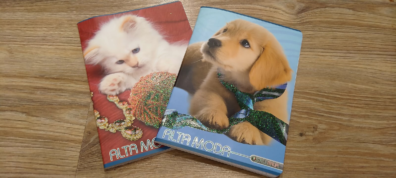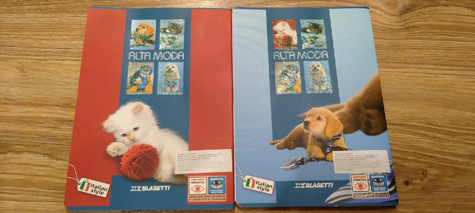 Купила дочке две тетради А5 Blasetti: одна голубенькая с щенком в галстуке, вторая красная с котенком и клубком.