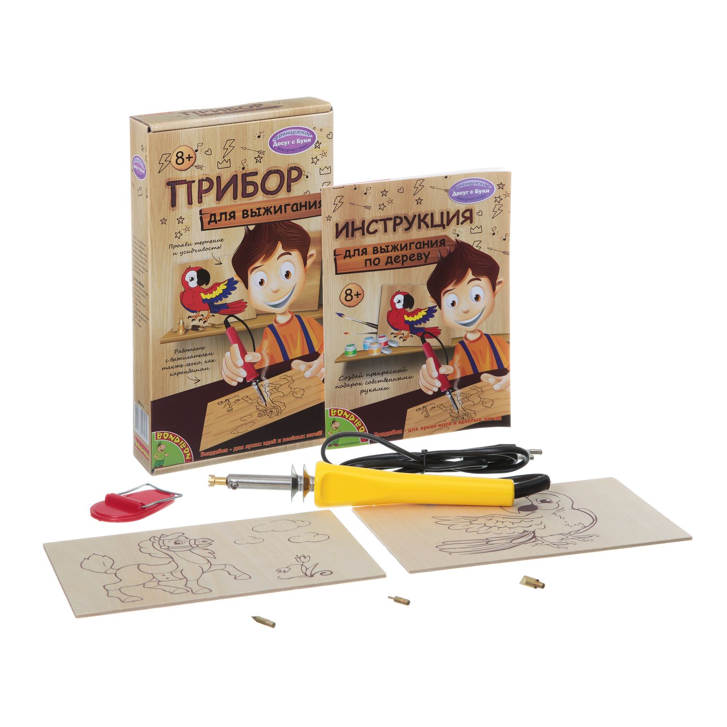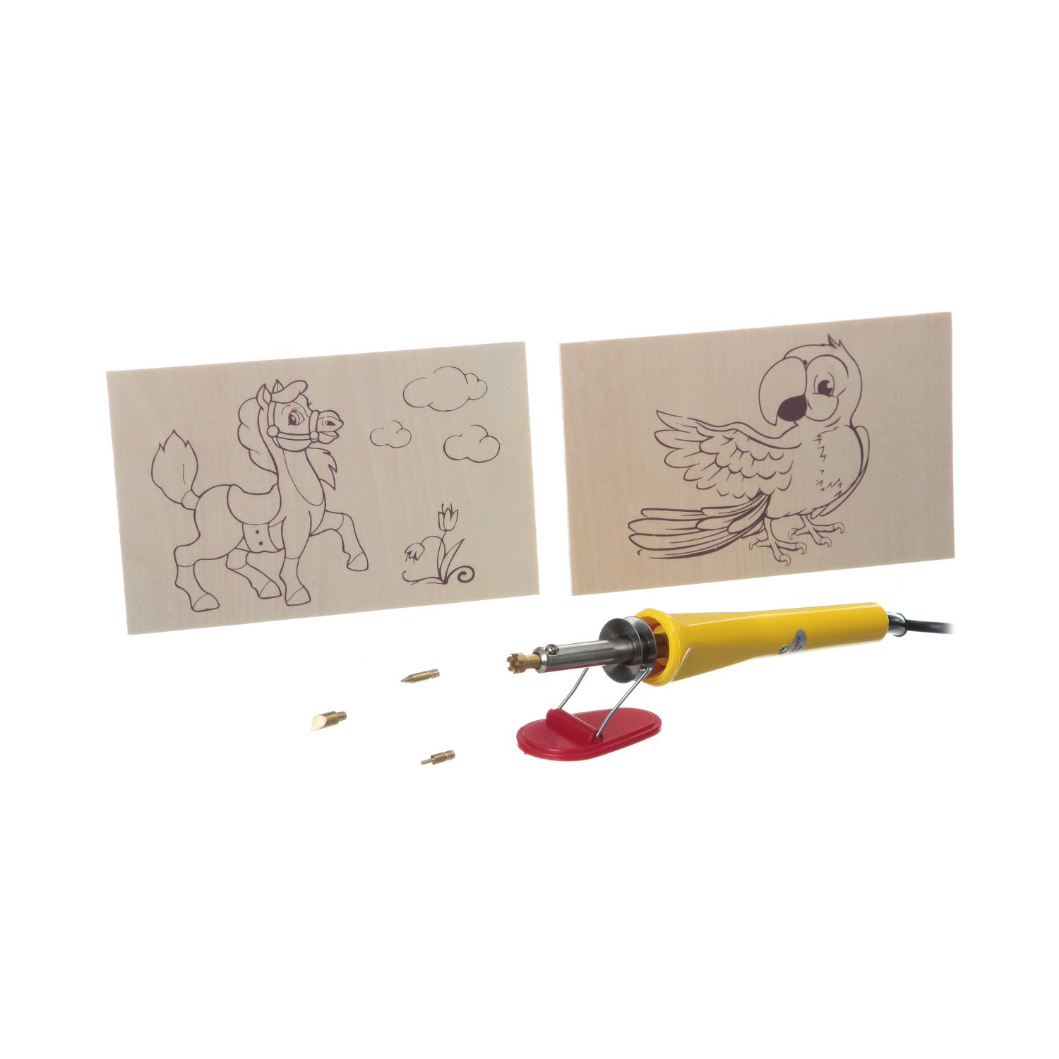 В наборе: выжигательный аппарат с основной насадкой и подставкой, 3 дополнительные насадки, 2 основы под выжигание с контурным рисунком (18,5х11,5 см)