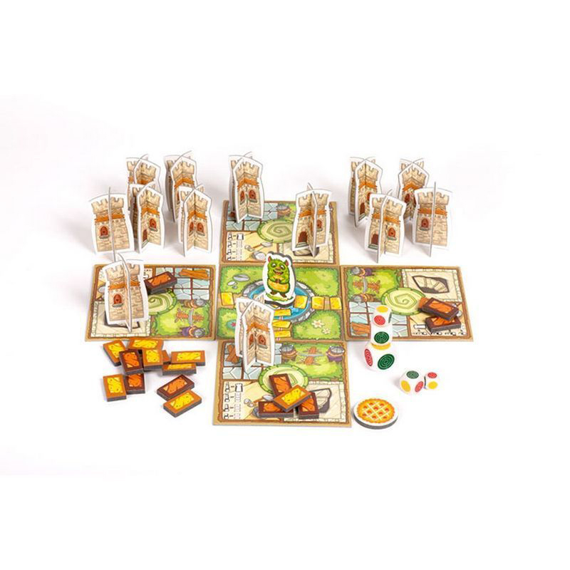 Подготовка к игре: необходимо отделить элементы замка, монстра, пирог и кирпичи от рамок, а затем собрать из них башенки и монстра. Игровое поле выкладывается на середину стола. Каждый играющий берёт фундамент и кладёт его в конце дорожки со своей стороны поля. Башни и кирпичи рядом с полем – это строительная площадка. Каждый игрок берёт одну башню и устанавливает её на своем фундаменте. Ход игры: участники стараются построить пирамидку из кубиков от большего к меньшему. В основании башни самый большой, наверху самый маленький. В свой ход игрок бросает сразу все пять кубиков. Самый большой кубик покажет цвет, который игрок будет собирать. Оставшиеся четыре кубика перебрасываются. Нужно, чтобы выпало как можно больше граней такого же цвета, как и на большом кубике, для этого кубики несколько раз можно перебросить. Но после каждого броска нужно поставить на пирамидку хотя бы один кубик. Если выпавший на кубиках цвет совпадает с цветом, который выпал на большом кубике, можно поставить сразу несколько. За собранные пирамидки игрок получает кирпичики, которые можно обменять на башню.
