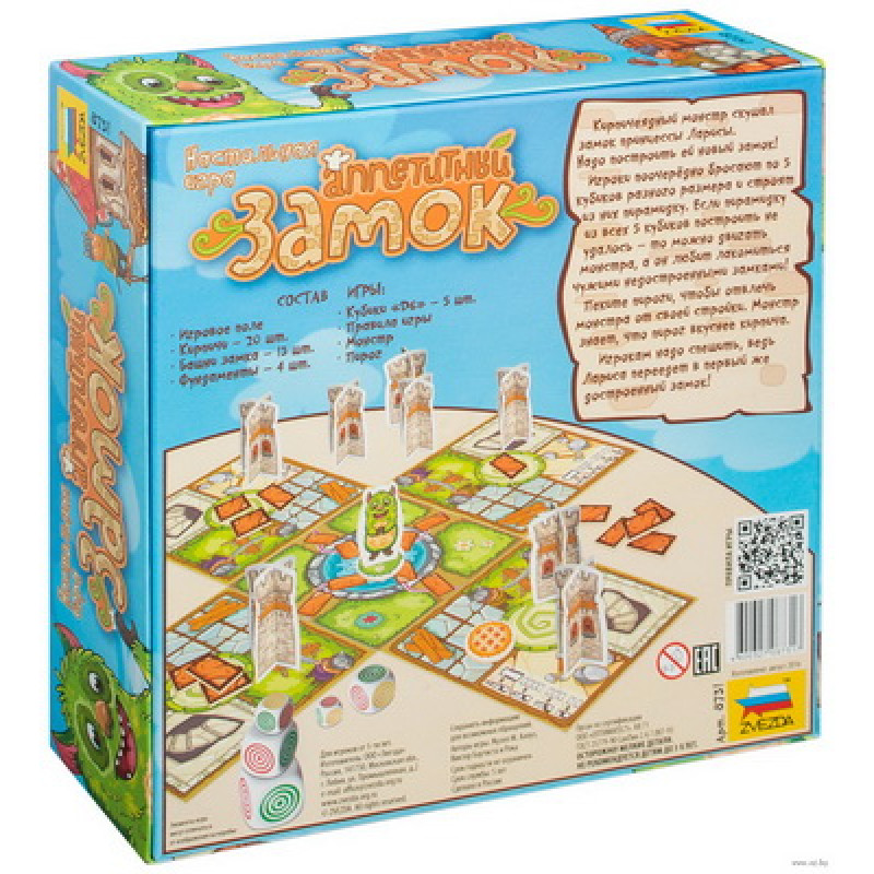 В игровой комплект входит: игровое двустороннее поле, башни замка – 13 шт, фундаменты – 4 шт, кирпичи – 20 шт, кубики – 5 шт, правила игры, монстр, пирог. Игра упакована в красочную упаковку размером 24,5 х 24,5 х 6,5 см.
