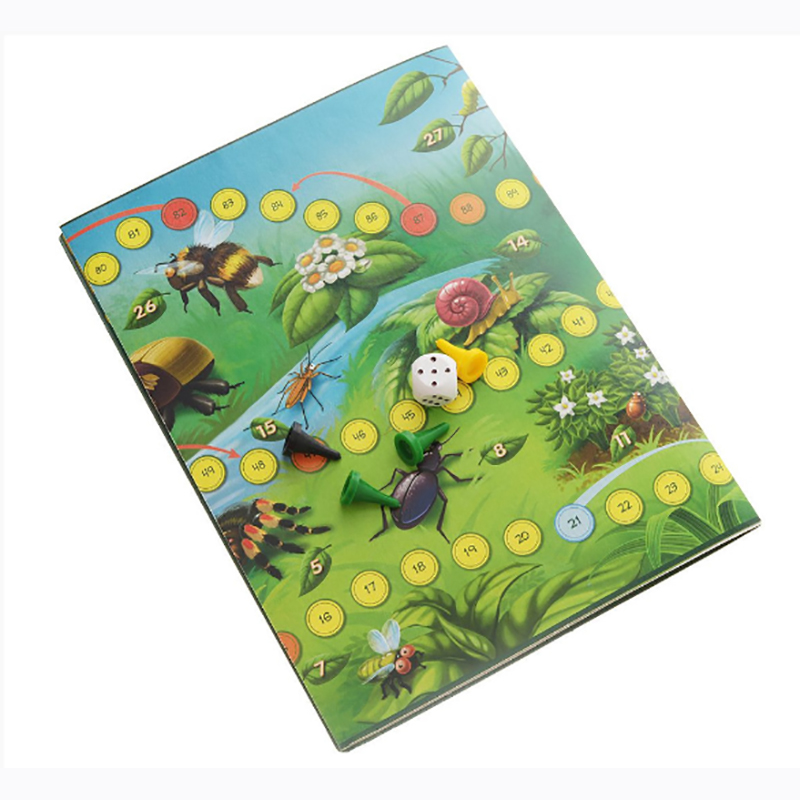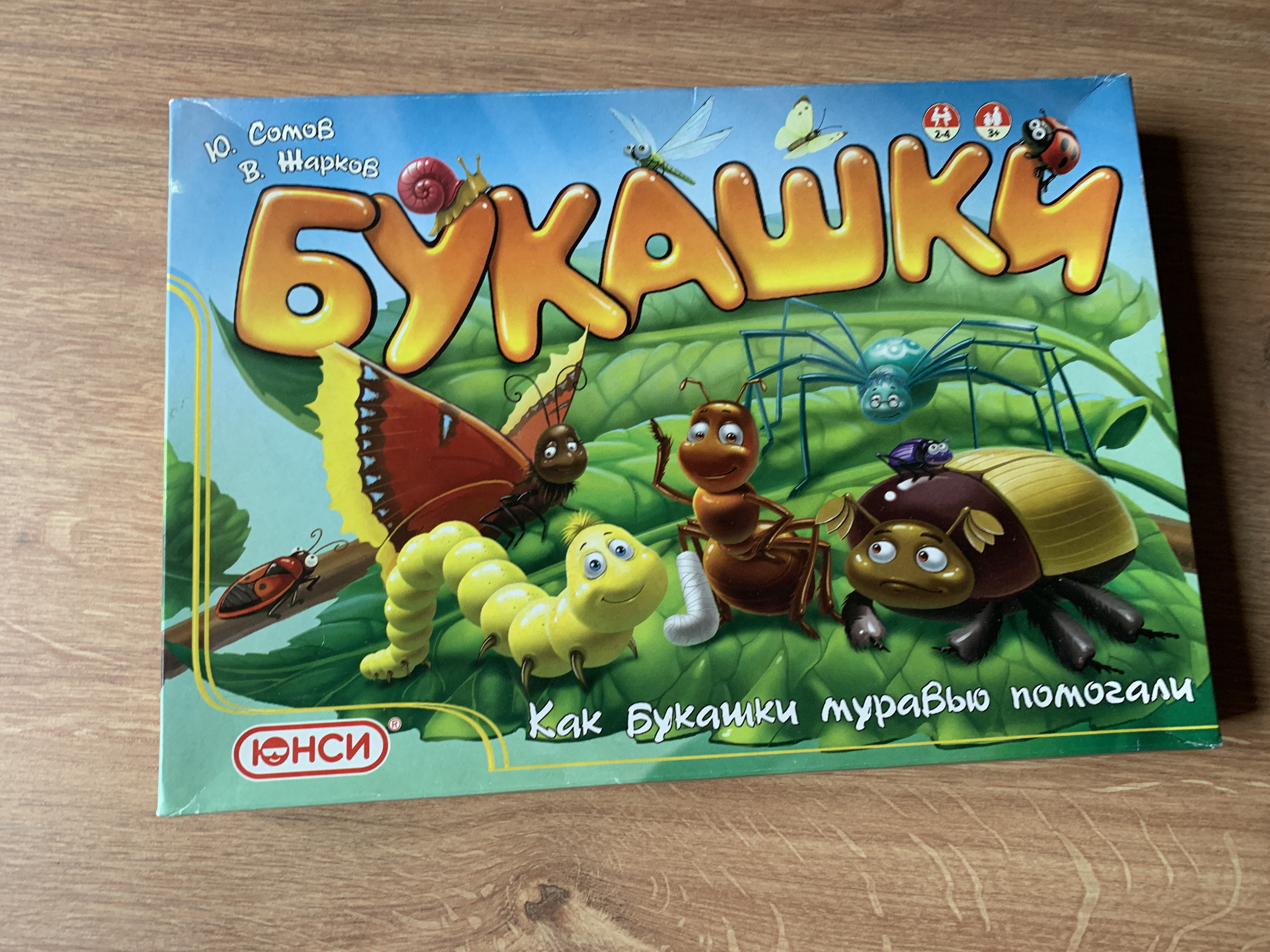 Настольная игра «Букашки» в пакете российской ТМ «Юнси» о милых козявочках и добрых букашечках выполнена по мотивам известной сказки Виталия Бианки «Как букашки муравью помогали». В комплект водит: красочное игровое поле из плотного картона, пластмассовые фишки разных цветов (4 шт.), пластмассовый кубик белого цвета с чёрными точками. Составляющие упакованы в полиэтиленовый пакет. Все насекомые, изображённые на игровом поле, имеют свой порядковый номер, а их точное название можно увидеть на картонной инструкции, прикрепленной к верхней части пакета (можно отойти от правил игры и углубиться в изучение мира насекомых).